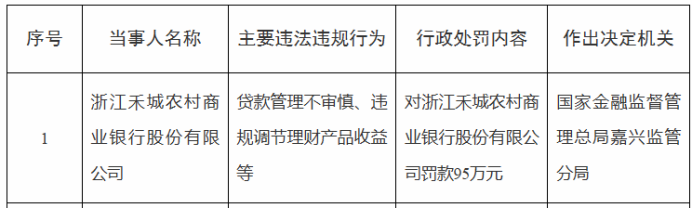 4月21日,国家金融监督管理总局嘉兴监管分局公示的行政处罚信息显示,浙江禾城农村商业银行股份有限公司因贷款管理不审慎、违规调节理财产品收益等被罚款95万元。