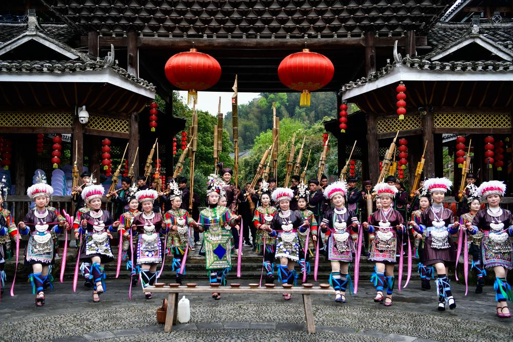 [신화망 중국 리핑 4월22일]지난 3월 23일 구이저우(貴州)성 자오싱(肇興) 둥자이(侗寨)에서 둥족 주민들이 귀빈을 위해 환영식을 선보이고 있다.