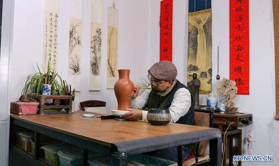간쑤(甘肅)성 출신의 '85허우(85後·1985년 이후 출생자)' 도예 장인 자오진펀(趙金盆)이 작업실에서 자도(紫陶)를 만들고 있다. (취재원 제공)