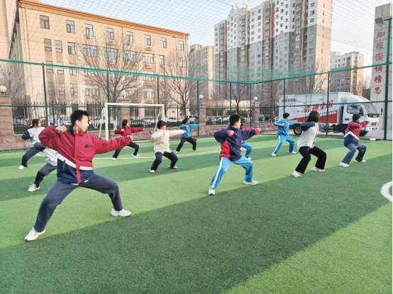 长清区推行“武术教练+体育教师”1+1课堂模式,武术教练精教招式,体育教师讲解科学原理。比如在教授“仆步穿掌”时,老师会带领学生测量运动心率、计算卡路里消耗,让学生直观理解每个动作的健身价值。