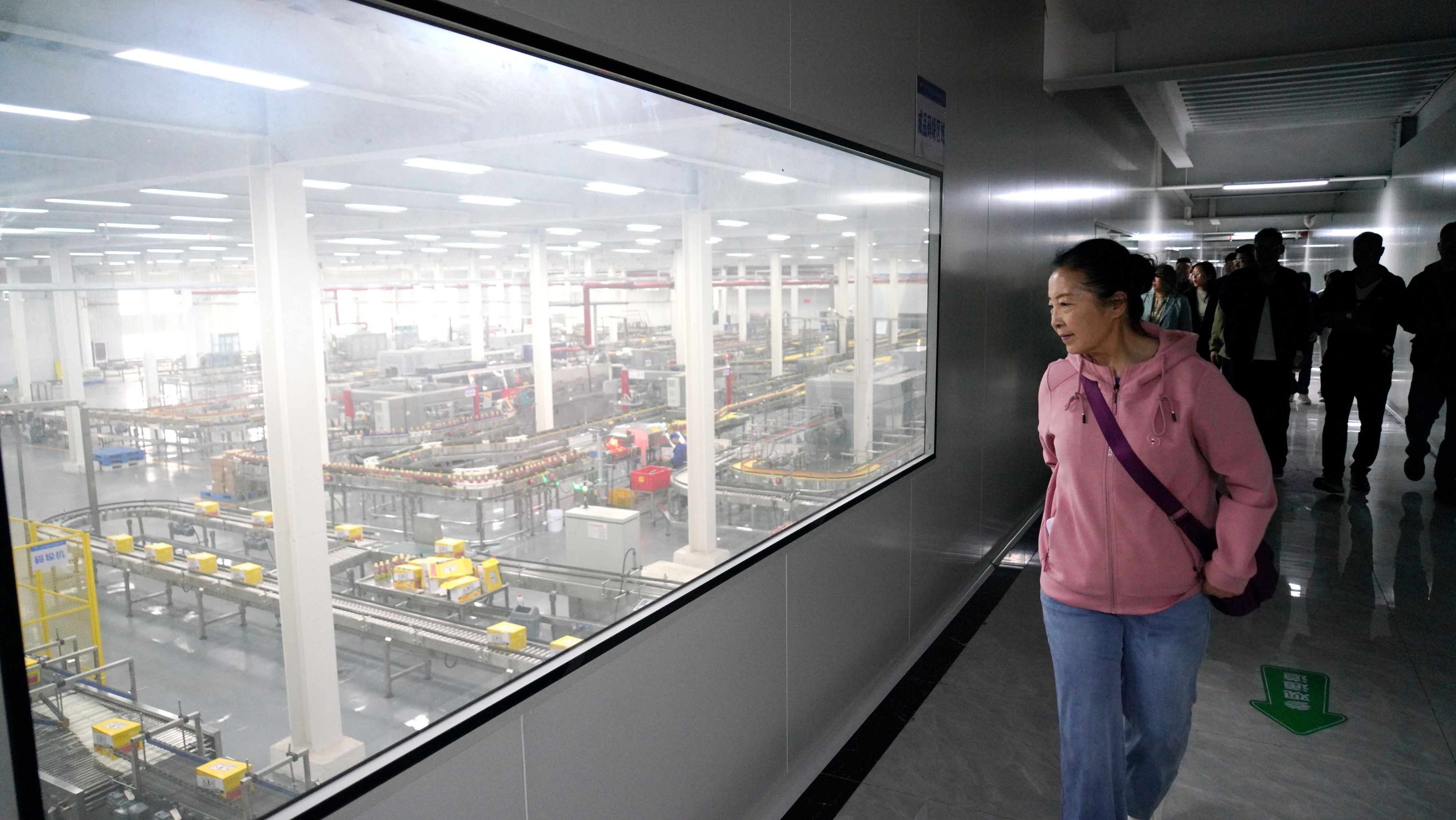 4月21日,游客在山东庄锦记食品有限公司工厂参观通道游览。
