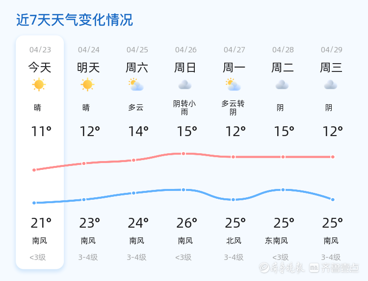 今天是4月23日,星期四,农历三月初七。济宁市迎来晴好天气,全市范围内普遍以晴朗为主,气温适宜。今天的最高气温为21℃,最低气温为11℃,目前气温为10.8℃,南风1级,空气湿度较高,达到99%,PM2.5指数为43,空气质量良好。市民朋友们可以在这样的好天气里享受户外活动,感受春日的美好。