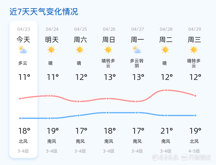 今天是4月23日,星期四,农历三月初七。青岛市今日天气多云转晴,气温在11℃至18℃之间,西北风2级,空气湿度为73%,PM2.5指数为37,空气质量良好。各区天气情况基本一致,均为多云转晴,气温变化不大。