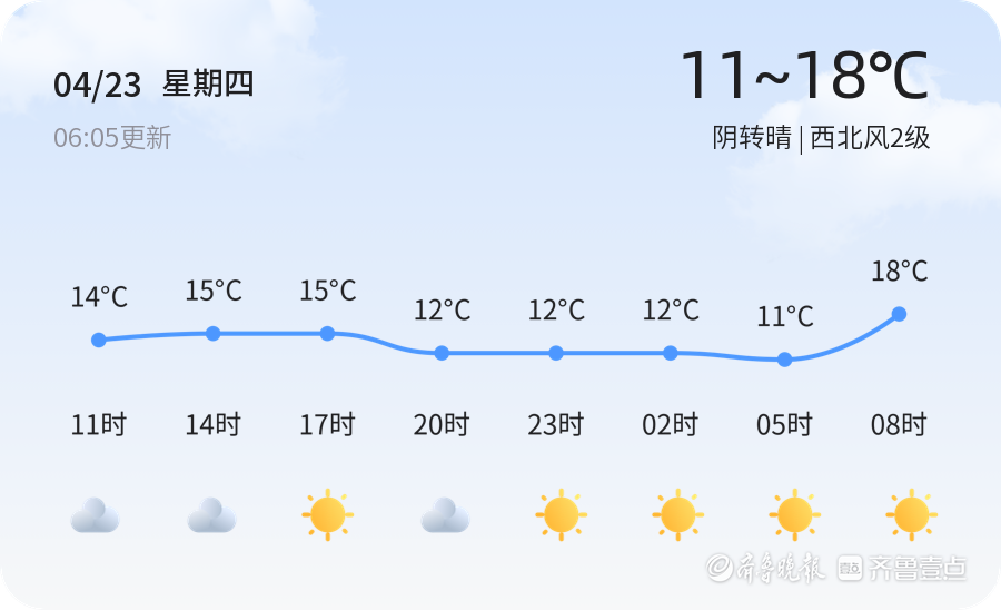 今天是4月23日,星期四,农历三月初七。威海市今日天气阴转晴,气温在11℃至18℃之间,西北风2级,空气湿度59%,空气质量为优(PM2.5指数27)。市民朋友们可以放心外出,享受这美好的一天。建议市民朋友在早晨和傍晚注意保暖,白天阳光充足,适合户外活动。空气质量优良,适合晾晒衣物和开窗通风。出行时请注意防晒,随身携带雨具以防天气变化。未来三天,威海市天气以晴好为主,气温逐步上升。明天(4月24日)将迎来晴朗天气,气温13℃至24℃,南风3-4级转4-5级。市民朋友们需要注意大风天气对出行的影响,尤其是阵风可能对高空作业和户外活动带来不便。后天(4月25日)天气晴转多云,气温14℃至24℃,西南风4-5级转3-4级。市民朋友们在户外活动时需注意防风。26日(周日)天气阴转小雨,气温12℃至23℃,南风3-4级转西北风。提醒市民朋友们携带雨具,注意交通安全。温馨提示