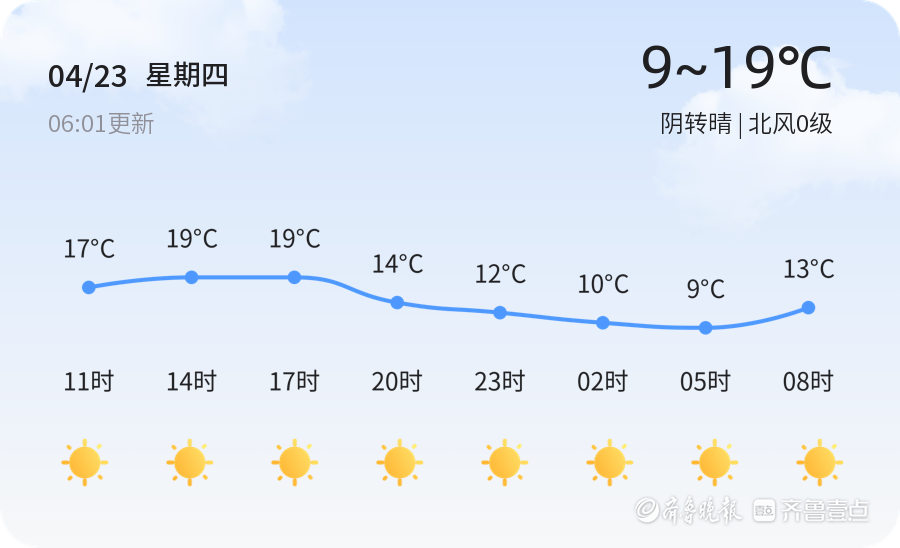 今天是4月23日,星期四,农历三月初七。枣庄市今日天气阴转晴,北风0级,目前气温为7.3℃,空气湿度为96%。PM2.5浓度为62,属于良好水平。市民出行请注意天气变化,适时增减衣物。预计今日白天气温逐渐上升,最高气温可达19℃,适合户外活动。
