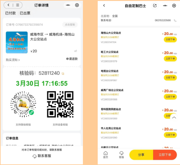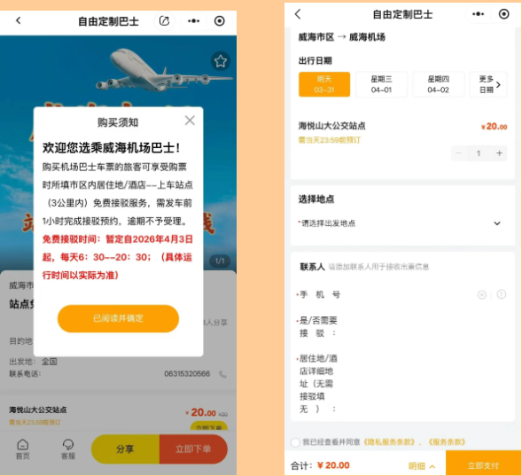 为进一步完善机场地面交通服务体系,提升旅客出行便捷性与体验感,山东省机场管理集团威海机场按照集团“两快一优”工作部署,联合威海公交集团巴士公司持续加密机场巴士班次、优化线路,创新推出站点免费接驳服务,实现航空客流与地面交通高效衔接,切实满足广大旅客多样化出行需求。凡购买机场巴士票的旅客,提前1小时线上购票预约,均可享受购票时所填机场巴士乘车站点3公里范围内免费接驳服务。