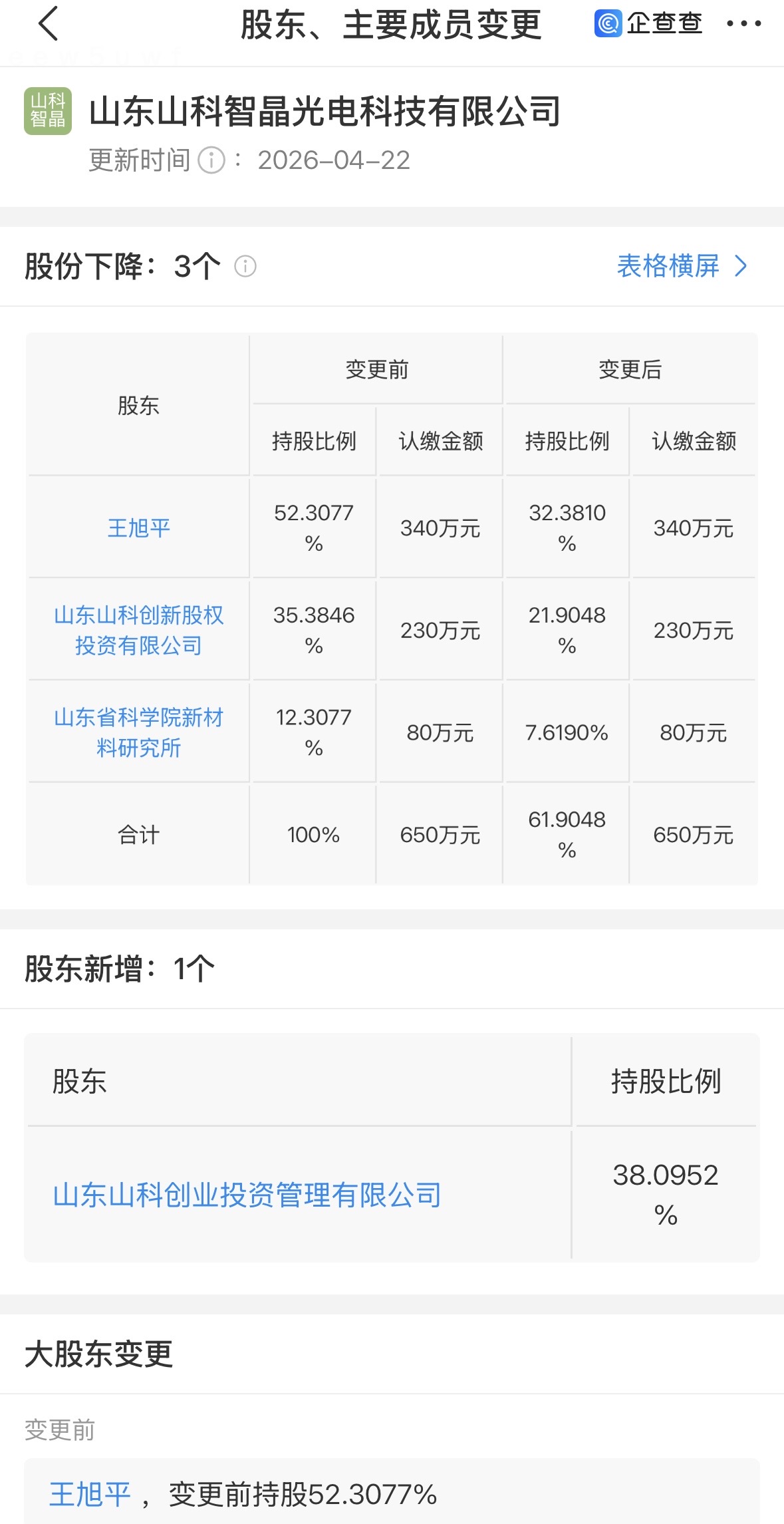 变更后,山科创投持有智晶光电38.10%的股份,成为公司大股东。原三名股东持股比例相应被稀释:创始人兼法定代表人王旭平的持股从52.31%降至32.38%;山东山科创新股权投资有限公司的持股从35.38%降至21.90%;山东省科学院新材料研究所的持股从12.31%降至7.62%。同时,智晶光电的注册资本从650万元增至1050万元。