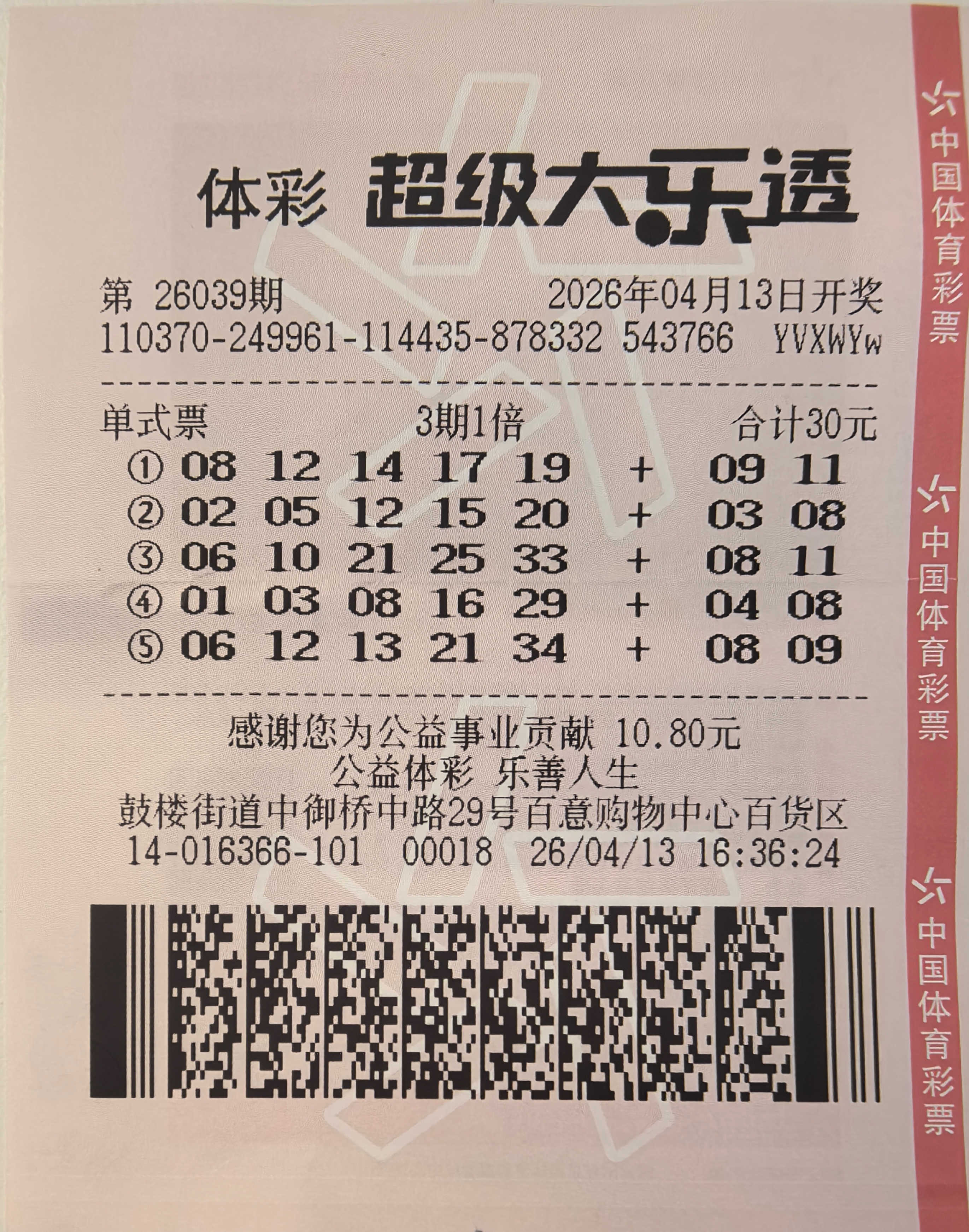 4月15日,超级大乐透第26040期开出中奖号码“06 12 13 21 34 + 08 09”,全国中出一等奖6注,其中山东唯一1注一等奖由济宁市兖州区购彩者中得。