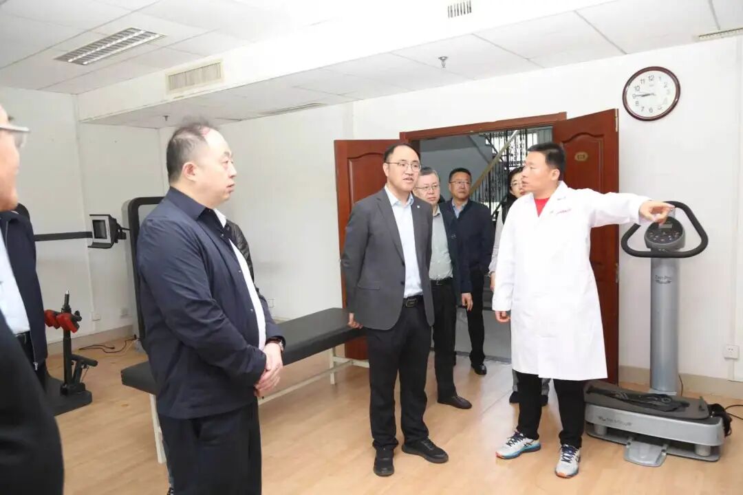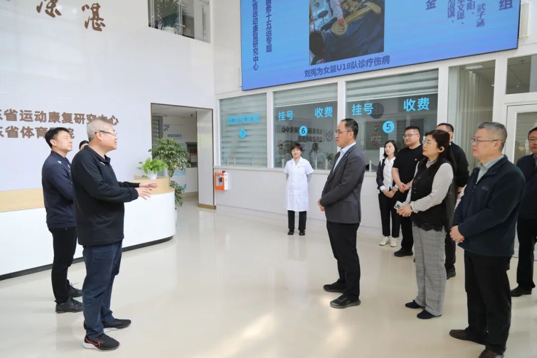 在山东省运动康复研究中心主任包信通的带领下,宋勇峰一行实地参观了运动医学科、运动康复科等核心科室,详细了解中心在运动性损伤防治、康复科研、运动队医疗保障等方面的工作成效,重点学习党员先锋岗在重大赛事保障中发挥的模范带头作用,为双方后续深化医疗康复合作奠定基础。