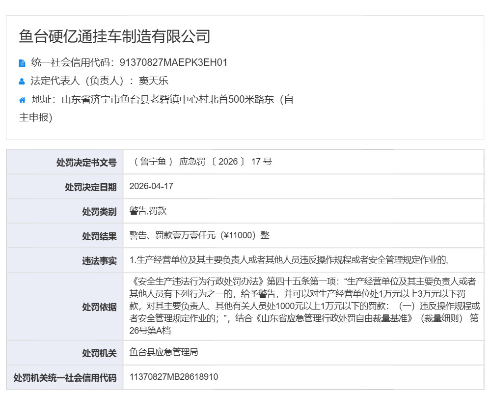 近日,记者在山东省应急管理厅官方网站上了解到,鱼台硬亿通挂车制造有限公司因存在.生产经营单位及其主要负责人或者其他人员违反操作规程或者安全管理规定作业的违法事实,依据《安全生产违法行为行政处罚办法》第四十五条第一项:“生产经营单位及其主要负责人或者其他人员有下列行为之一的,给予警告,并可以对生产经营单位处1万元以上3万元以下罚处罚依据款,对其主要负责人、其他有关人员处1000元以上1万元以下的罚款:(一)违反操作规程或者安全管理规定作业的;”,结合《山东省应急管理行政处罚自由裁量基准》(裁量细则)第26号第A档,被鱼台县应急管理局警告并罚款11000元。