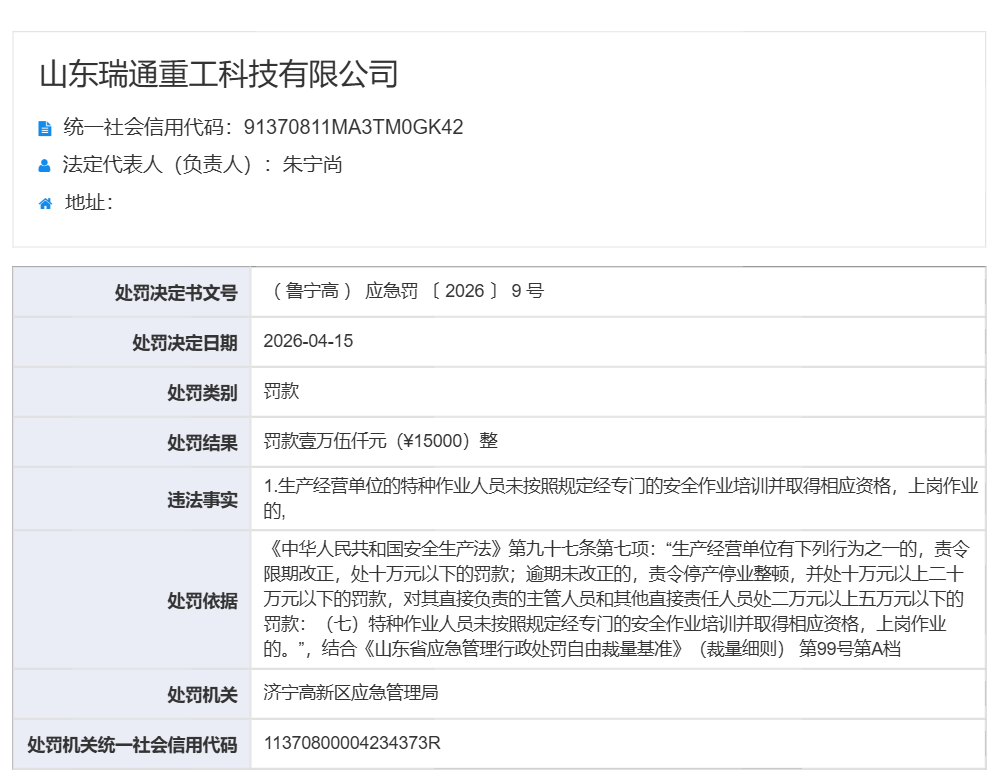 山东瑞通重工科技有限公司被罚款15000元