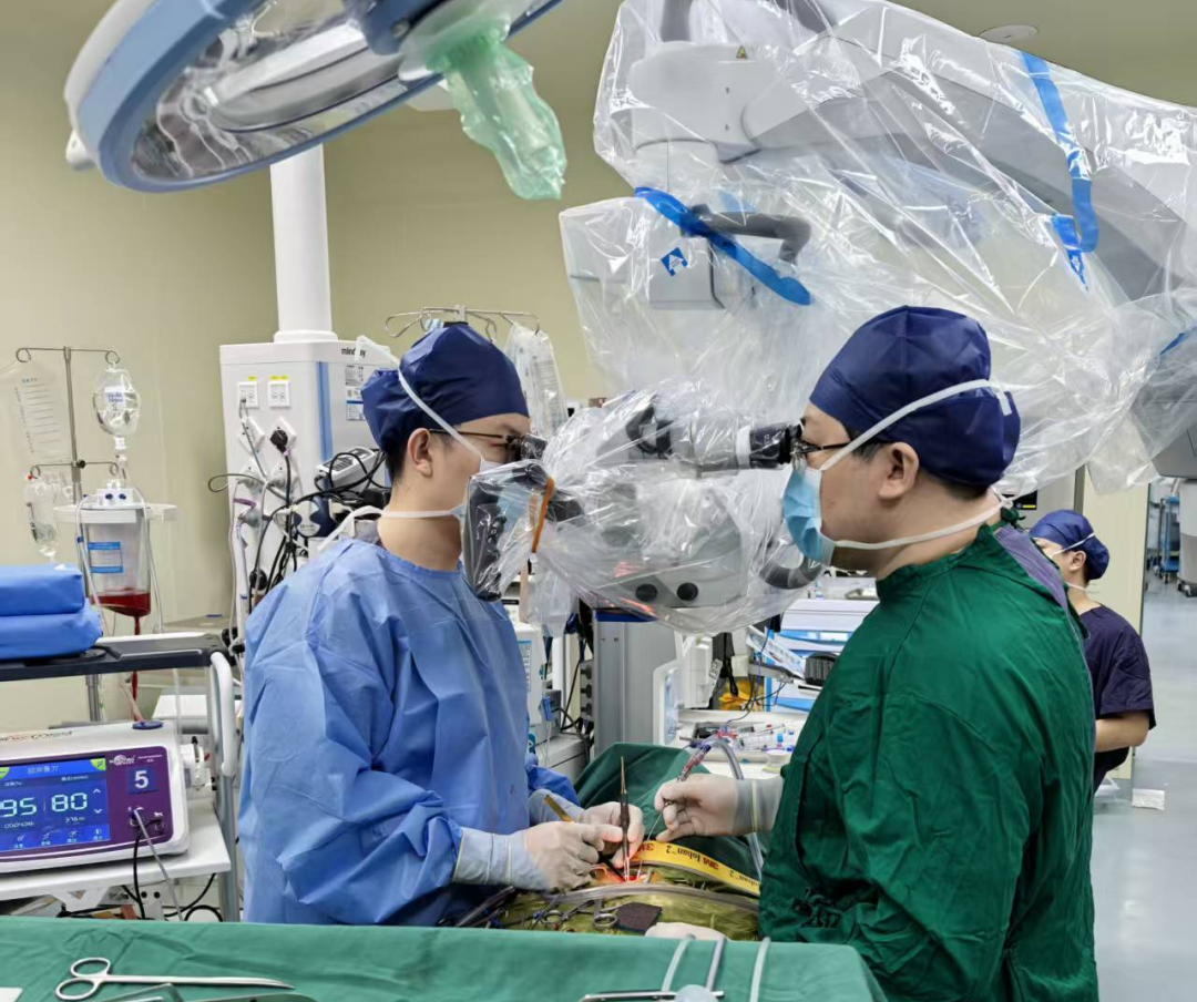 手术于深夜12点正式开始。宁斌团队在麻醉与护理团队的全程紧密配合中,依托中心先进手术显微镜等高精尖设备,一场精细到毫米级的神经修复手术在高度紧张中有序进行。术中可见,患者脊髓受血肿压迫严重肿胀,随时可能发生不可逆坏死。手术团队精益求精,在高倍显微视野下精准定位病灶,轻柔分离脆弱神经纤维,彻底清除血肿并完整切除出血肿瘤,成功解除脊髓压迫。从脊髓组织剥离、病灶清除到多层精密缝合,每一步操作严谨细致,全力避免二次损伤。历经近4小时通宵奋战,次日凌晨4时许,手术圆满完成。