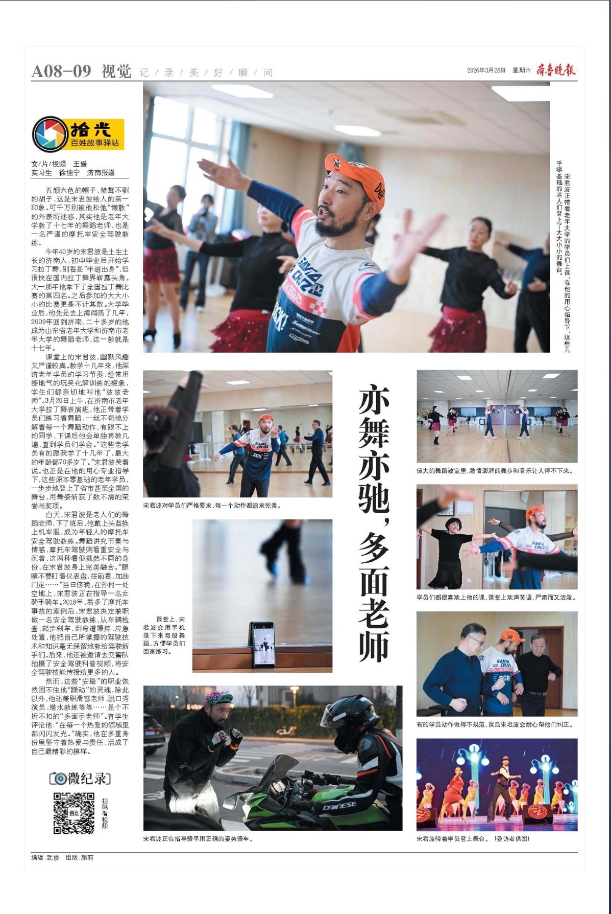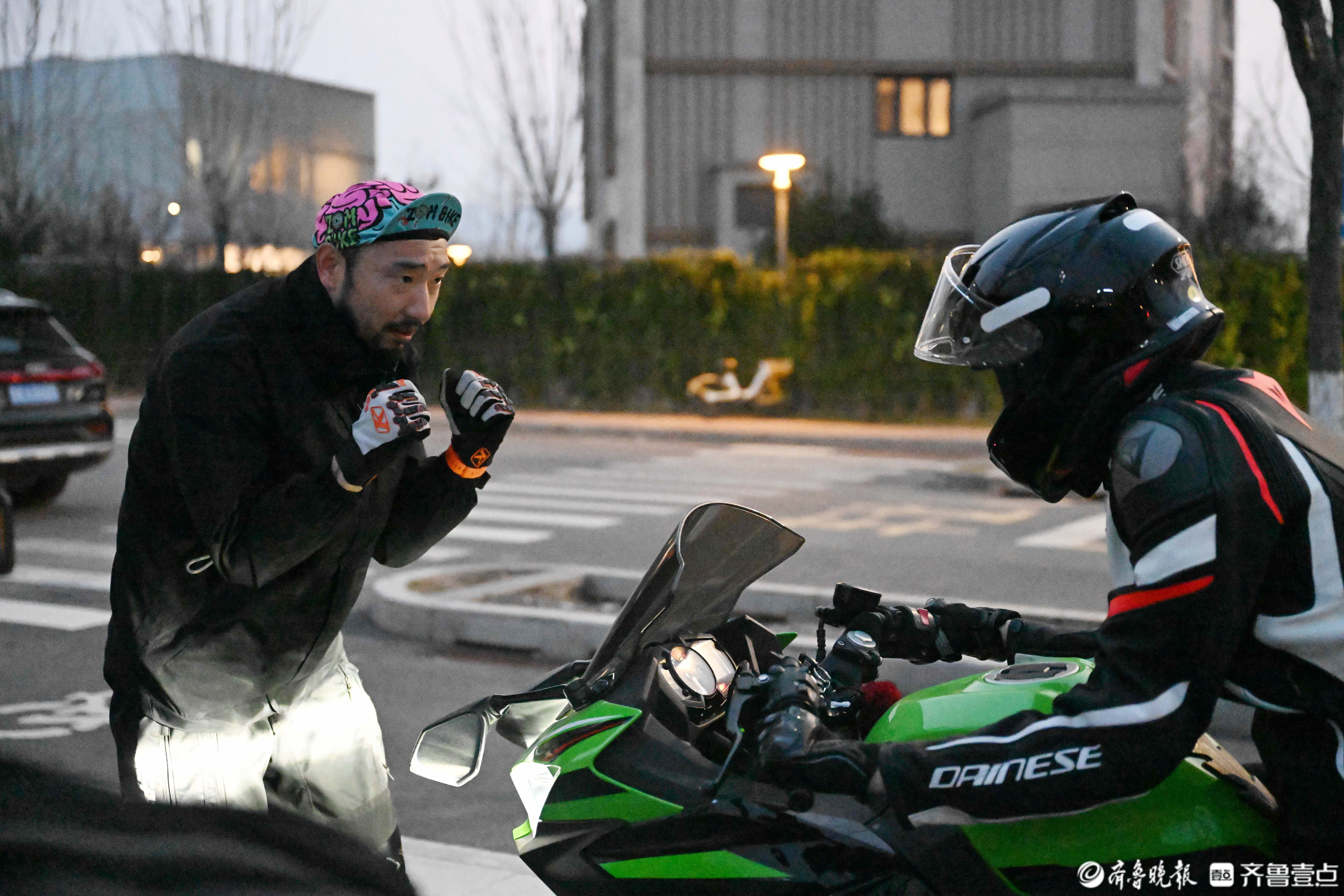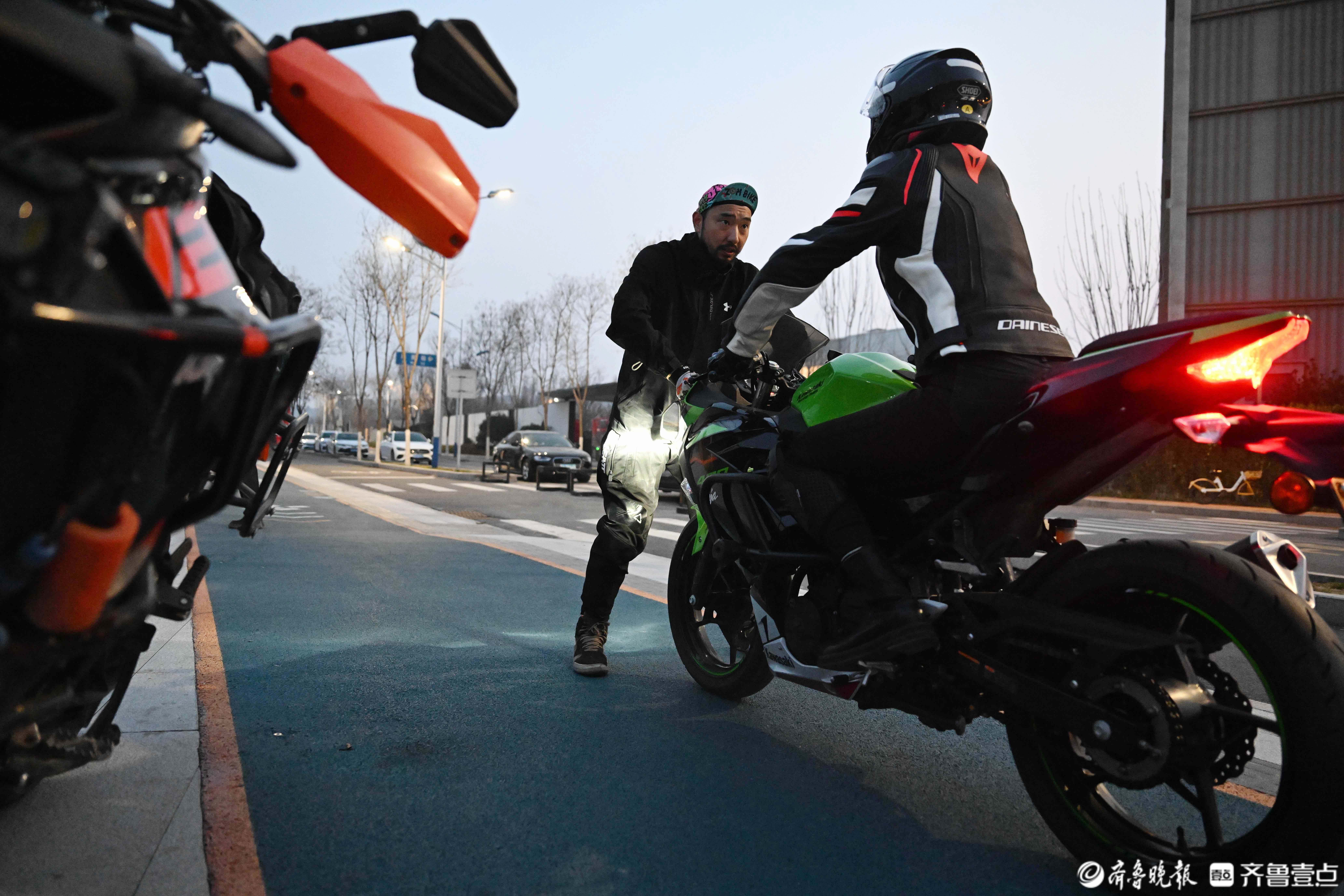 白天,宋君波是老人们的舞蹈老师,下了班后,他戴上头盔换上机车服,成为年轻人的摩托车安全驾驶教练。舞蹈讲究节奏与情感,摩托车驾驶则看重安全与沉着,这两种看似截然不同的身份,在宋君波身上完美融合。“眼睛不要盯着仪表盘,往前看,加油门走……”当日傍晚,在孙村一处空地上,宋君波正在指导一名女骑手骑车。2018年,看多了摩托车事故的案例后,宋君波决定兼职做一名安全驾驶教练,从车辆检查、起步刹车,到弯道操控、应急处置,他把自己所掌握的驾驶技术和知识毫无保留地教给驾驶新手们。后来,他还被邀请去交警队拍摄了安全驾驶科普视频,将安全驾驶技能传授给更多的人。