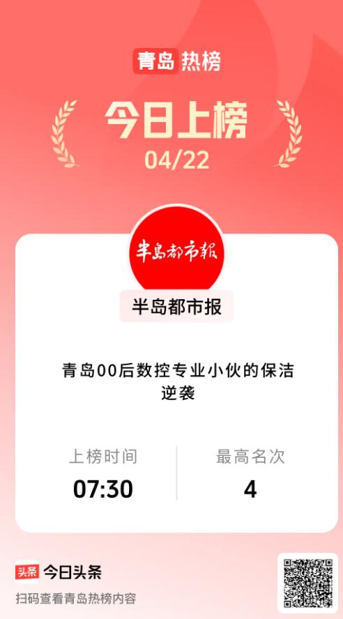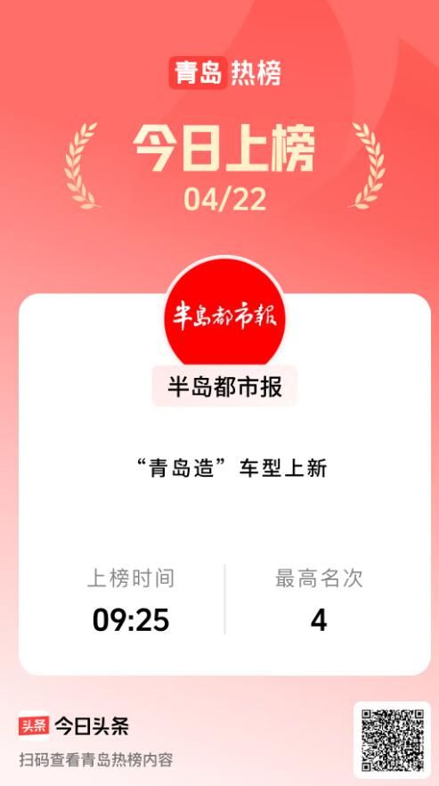 过去24小时内半岛都市报头条号这些作品登上平台热榜↓↓↓稿件《“青岛造”车型上新》登上青岛热榜,最高名次为第四名https://www.toutiao.com/video/7631480852614774820/稿件《青岛00后数控专业小伙的保洁逆袭》登上青岛热榜,最高名次为第四名https://www.toutiao.com/video/7631415436094046244/