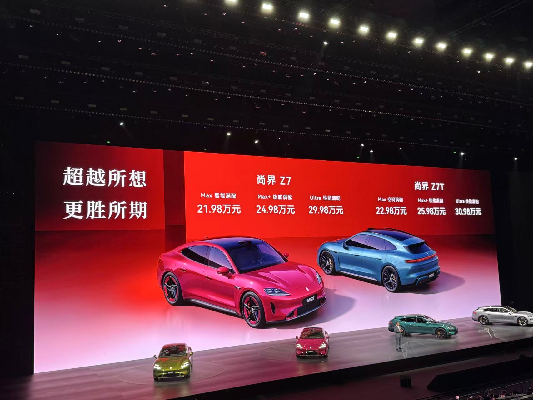 本次发布会正式推出首款风尚科技轿跑尚界Z7与首款猎装车型尚界Z7T。Z7 Max版21.98万元起、Ultra版29.98万元;Z7T Max版22.98万元起、Ultra版30.98万元,全系标配华为乾崑智驾ADS 4.1、896线双光路图像级激光雷达、途灵智能底盘与巨鲸800V高压平台。CLTC纯电续航最高905公里,零百加速3.44秒,百零制动33.1米,车身高强钢+铝合金占比91%,安全性能拉满。