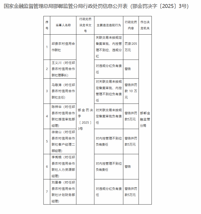 4月22日,国家金融监督管理总局邯郸金融监管分局公示的行政处罚信息公开表显示,邱县农村信用合作联社因关联交易未按规定备案审批、内控管理不到位、违规分红被罚款205万元。同时,王义川(时任邱县农村信用合作联社理事长)因对违规分红负有责任,被警告;马敬涛(时任邱县农村信用合作联社主任)因对关联交易未按规定备案审批、内控管理不到位负有责任,被警告并罚款10万元;陈祥华(时任邱县农村信用合作联社授信审批部经理)因对关联交易未按规定备案审批负有责任,被警告并罚款5万元;徐俊山(时任邱县农村信用合作联社客户经理二部经理)因对内控管理不到位负有责任,被警告并罚款5万元;李秀娥(时任邱县农村信用合作联社人力资源部经理)因对内控管理不到位负有责任,被警告;刘景春(时任邱县农村信用合作联社计划财务部经理)因对违规分红负有责任,被警告并罚款5万元。