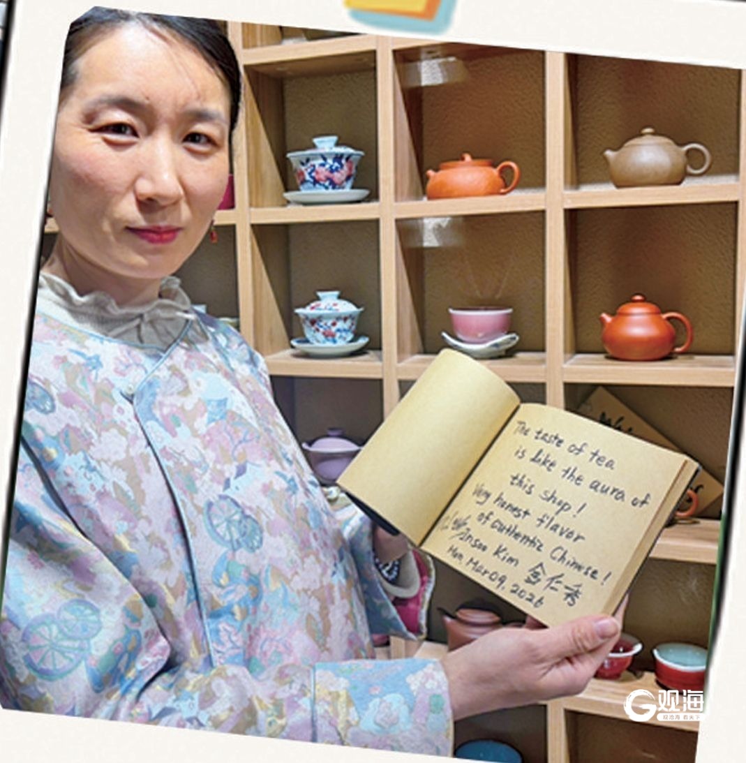 无己茶堂主理人耿鑫展示外国游客的留言。马晓婷 摄