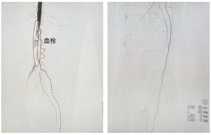 在血栓负荷基本清除后,团队进一步行球囊扩张及支架植入术处理狭窄的血管基础病变。术后即刻造影显示,股浅动脉及腘动脉血流通畅,远端胫后动脉及腓动脉显影良好。