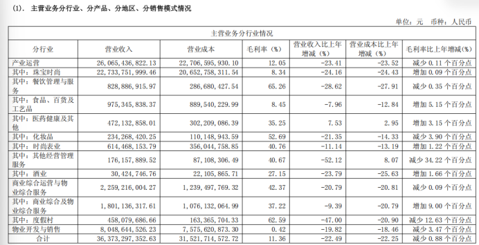 在报告中,豫园股份表示,珠宝时尚营业收入、营业成本较上年同期减少,主要是由于公司黄金饰品销售业务受消费行业结构调整和国际金价持续震荡波动影响。餐饮管理与服务营业收入、营业成本较上年同期减少,主要是由于公司餐饮连锁业务受消费行业结构调整影响,公司积极调整产品结构和门店策略,关闭低效亏损门店。