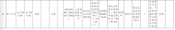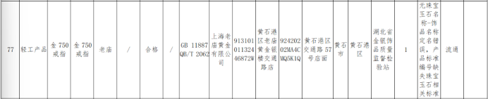 近日,湖北省市场监督管理局发布的产品质量监督抽查情况通报显示,2批次由上海老庙黄金有限公司生产的金750戒指、金750项链抽检存在标签及其他标识物不合格问题。不合格项目分别为:无珠宝玉石名称,产品标准编号错误且缺失珠宝玉石相关标准;无珠宝玉石名称-饰品名称定名错误,产品标准编号缺失珠宝玉石相关标准。