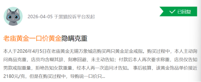 有消费者在“黑猫投诉”平台表示,购买了两只黄金足金戒指,“在购买过程中,本人主动询问商品克重,店员均含糊其辞、刻意回避、未主动告知;付款后本人再次要求称重,店员仅告知男款戒指重量,拒绝告知女款重量,经本人再一次追问才告知。事后核算,该黄金饰品单价接近2180元/克,但是在购买过程中,导购说一口价只是比克价卖的稍微贵一些。”