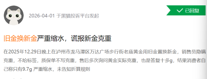 还有消费者在“黑猫投诉”平台投诉,在老庙黄金以旧换新时,销售员隐瞒克重,不给标签,质保单不写克重,“多次询问黄金实际克重,也是答复十多克,结果自己称只有9.7克,严重缩水。”