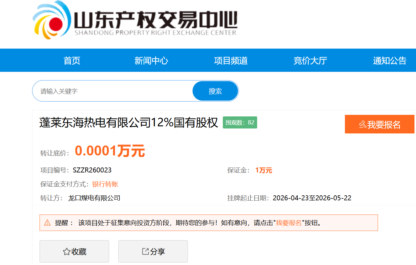 4月23日,蓬莱东海热电有限公司(下称“蓬莱东海热电”)12%国有股权在山东产权交易中心挂牌转让,转让方为龙口煤电有限公司(下称“龙口煤电”),转让底价为1元。