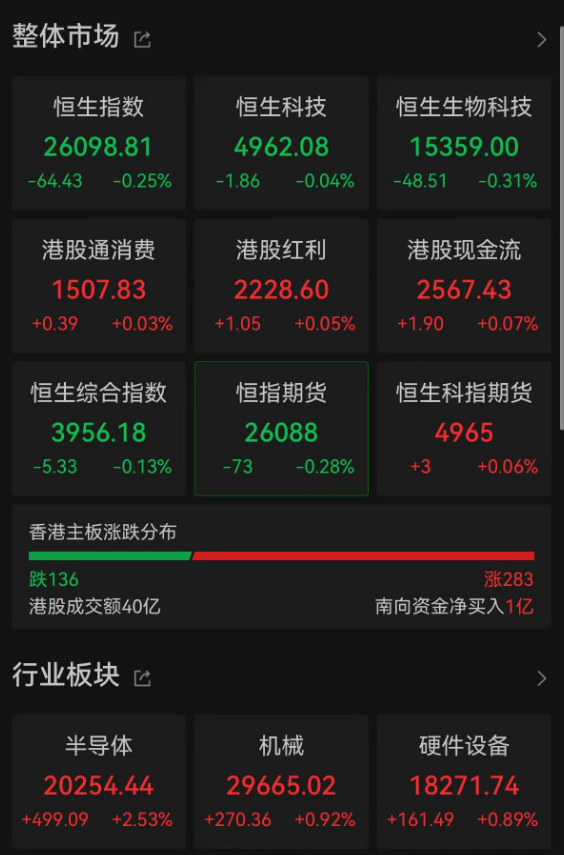 23日,港股主要指数小幅低开,恒指跌0.25%,恒生科技指数跌0.04%。板块方面,半导体、机械、硬件设备领涨。科网股普跌,截至发稿,阿里巴巴、腾讯控股、网易、泡泡玛特、美团等集体下跌。