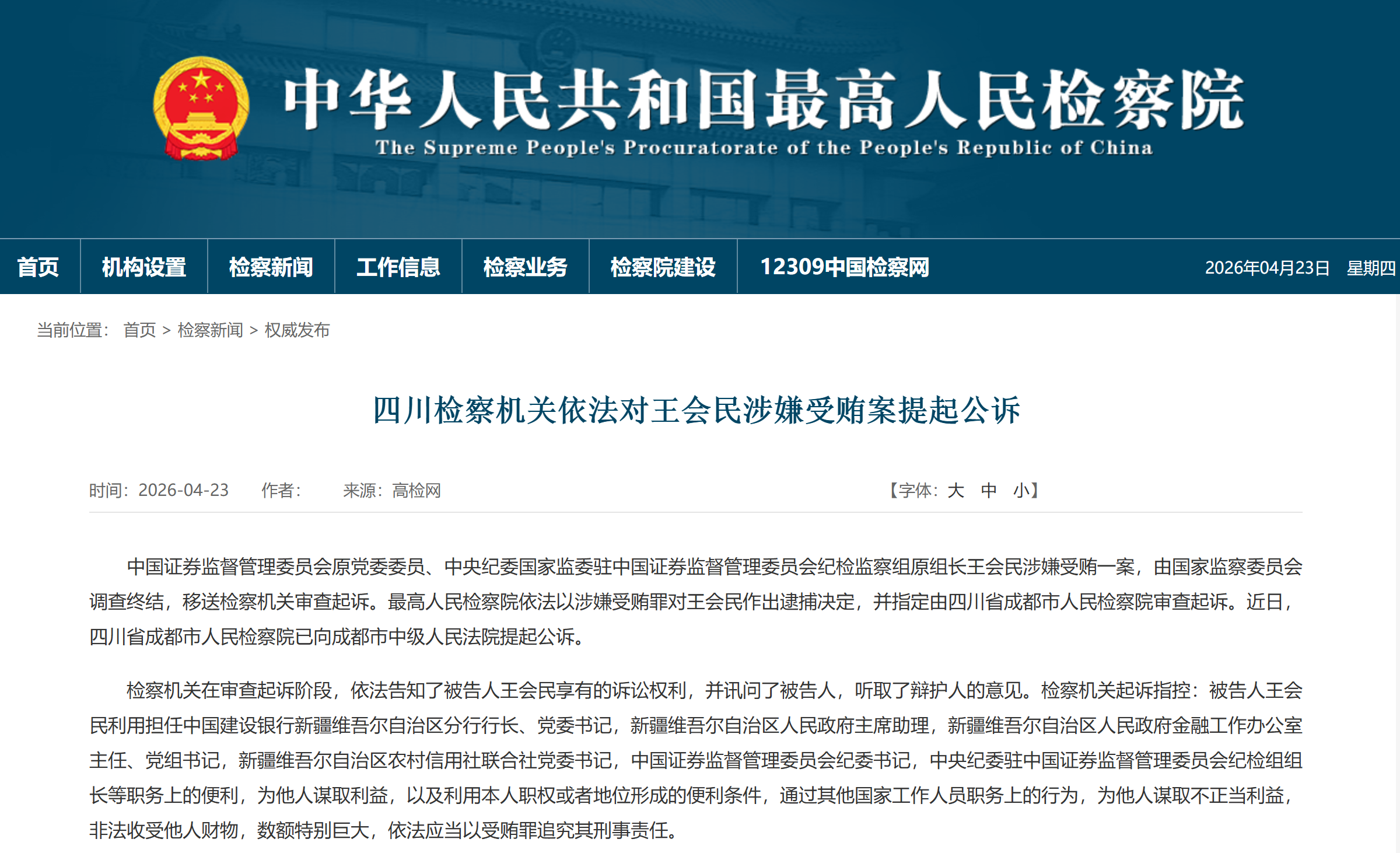 高检网4月23日消息,中国证券监督管理委员会原党委委员、中央纪委国家监委驻中国证券监督管理委员会纪检监察组原组长王会民涉嫌受贿一案,由国家监察委员会调查终结,移送检察机关审查起诉。最高人民检察院依法以涉嫌受贿罪对王会民作出逮捕决定,并指定由四川省成都市人民检察院审查起诉。近日,四川省成都市人民检察院已向成都市中级人民法院提起公诉。
