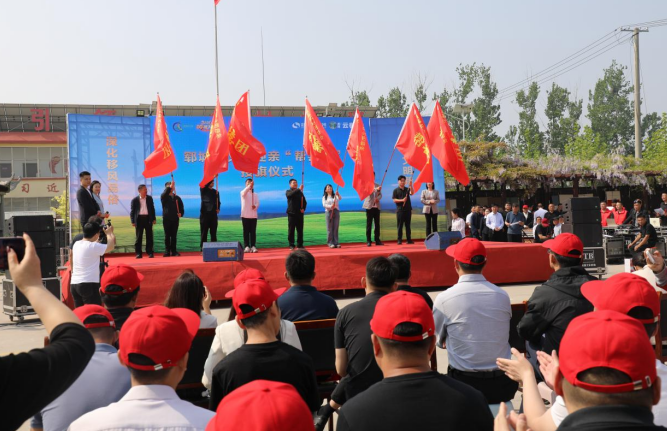 旗帜猎猎,文明领航。来自郭屯镇、陈坡乡等7个乡镇街道的“帮囍团”代表接过鲜红旗帜。郭屯镇宣传委员朱家玉使劲挥了挥旗杆:“我们给低彩礼、零彩礼新人免费送婚礼全流程志愿服务,包括红地毯、拱门、音响、礼仪主持等,连贴喜字、做喜饼我们都包了。”