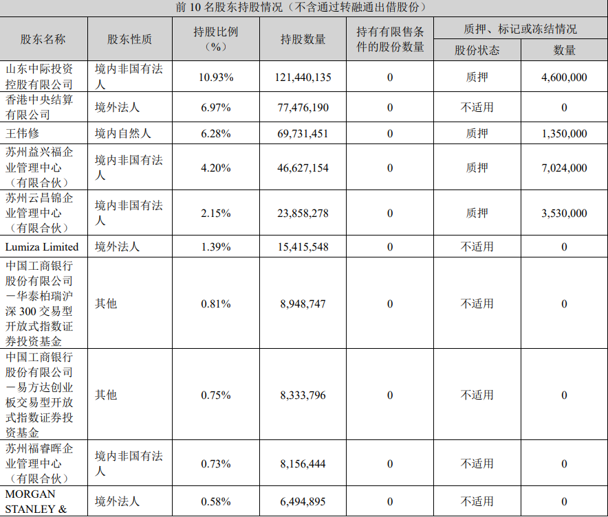 截至3月末,山东中际投资控股有限公司为中际旭创第一大股东,持股数量为1.21亿股,持股比例为10.93%;香港中央结算有限公司持股数量为7747.62万股,比例为6.97%;中际旭创实控人兼创始人王伟修持股数量为6973.15万股,比例为6.28%。