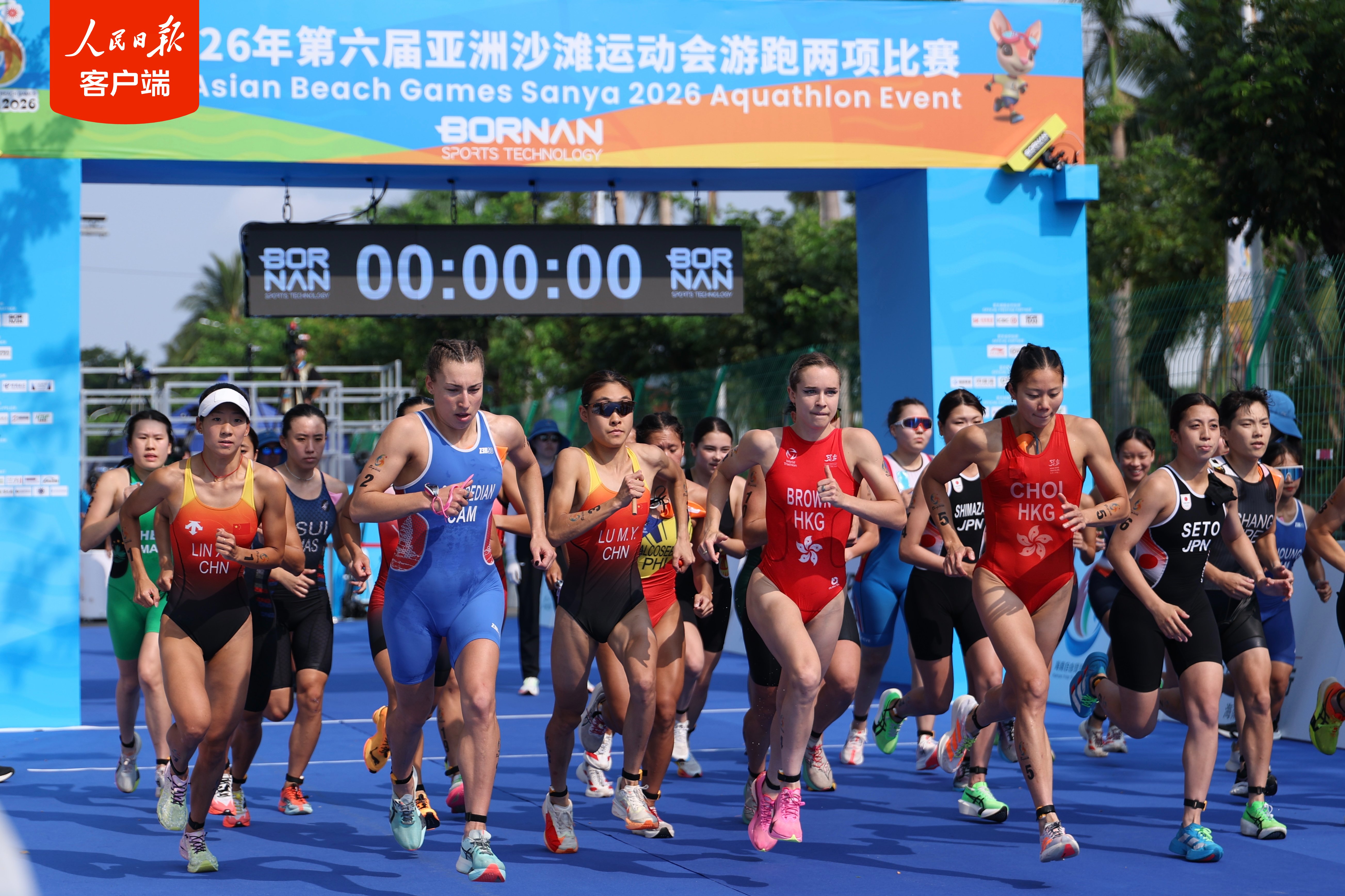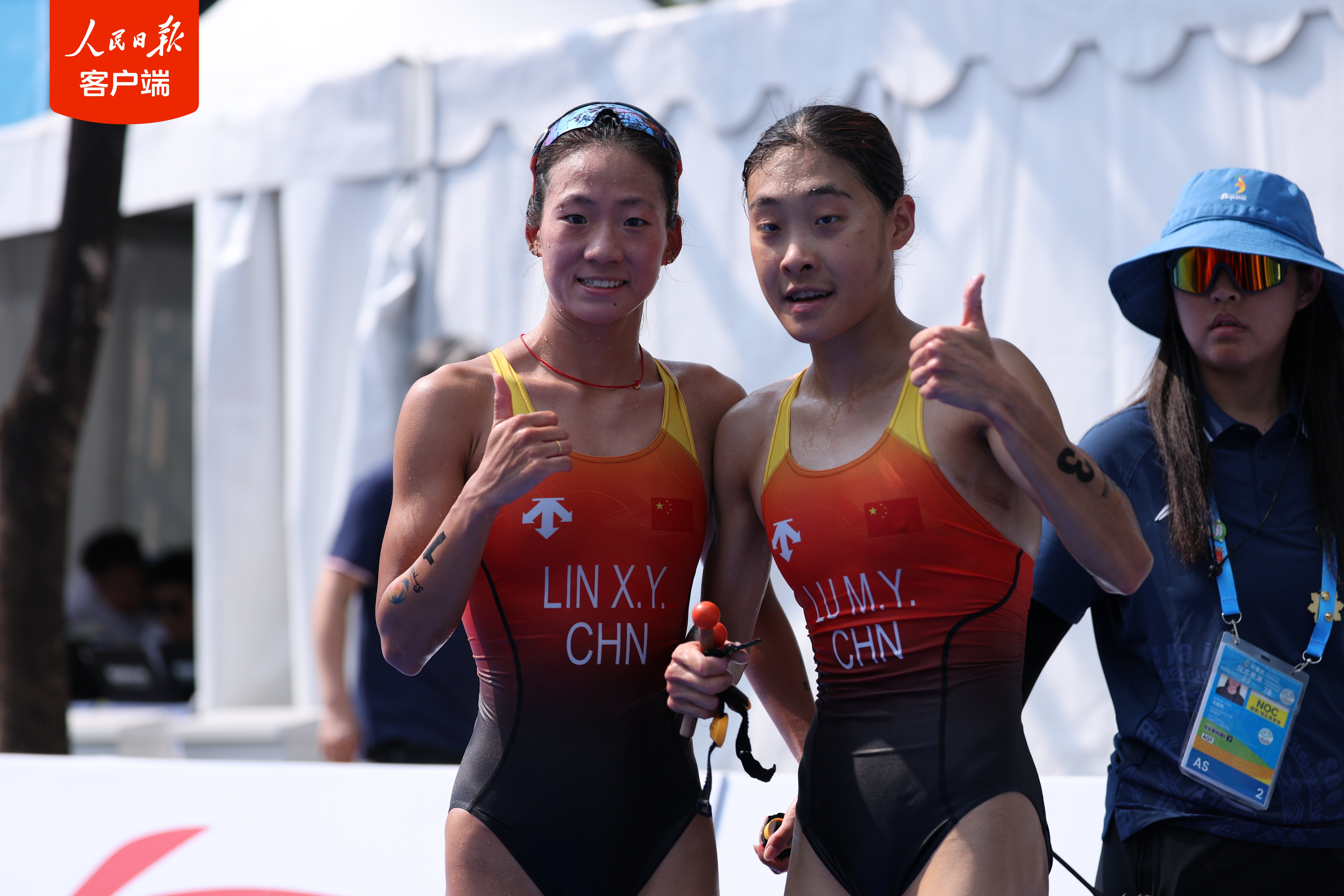 4月23日上午,在三亚亚沙会游跑两项女子个人比赛中,中国队选手林鑫瑜率先冲过终点线,夺得冠军,另一位中国队选手陆美伊摘得铜牌。中国体育代表团包揽本届亚沙会游跑两项个人比赛两枚金牌。(人民日报客户端)