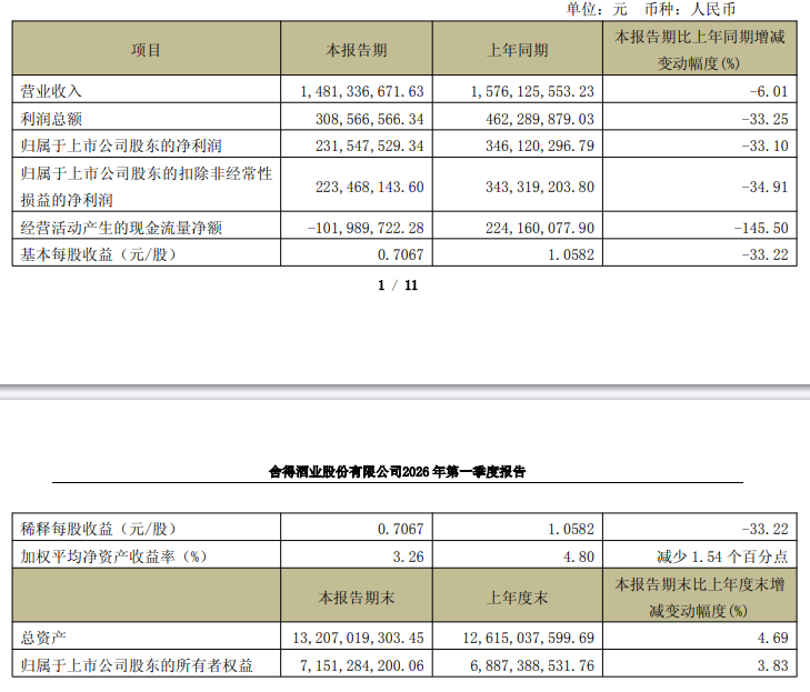 具体来看,今年1至3月份,舍得酒业实现营业收入14.81亿元,同比下降6.1%,实现归属于上市公司股东的净利润2.32亿元,同比下降33.1%,报告期内公司经营活动现金流净额为-1.02亿元,与2025年一季度的2.24亿元相比,现金流向截然相反。