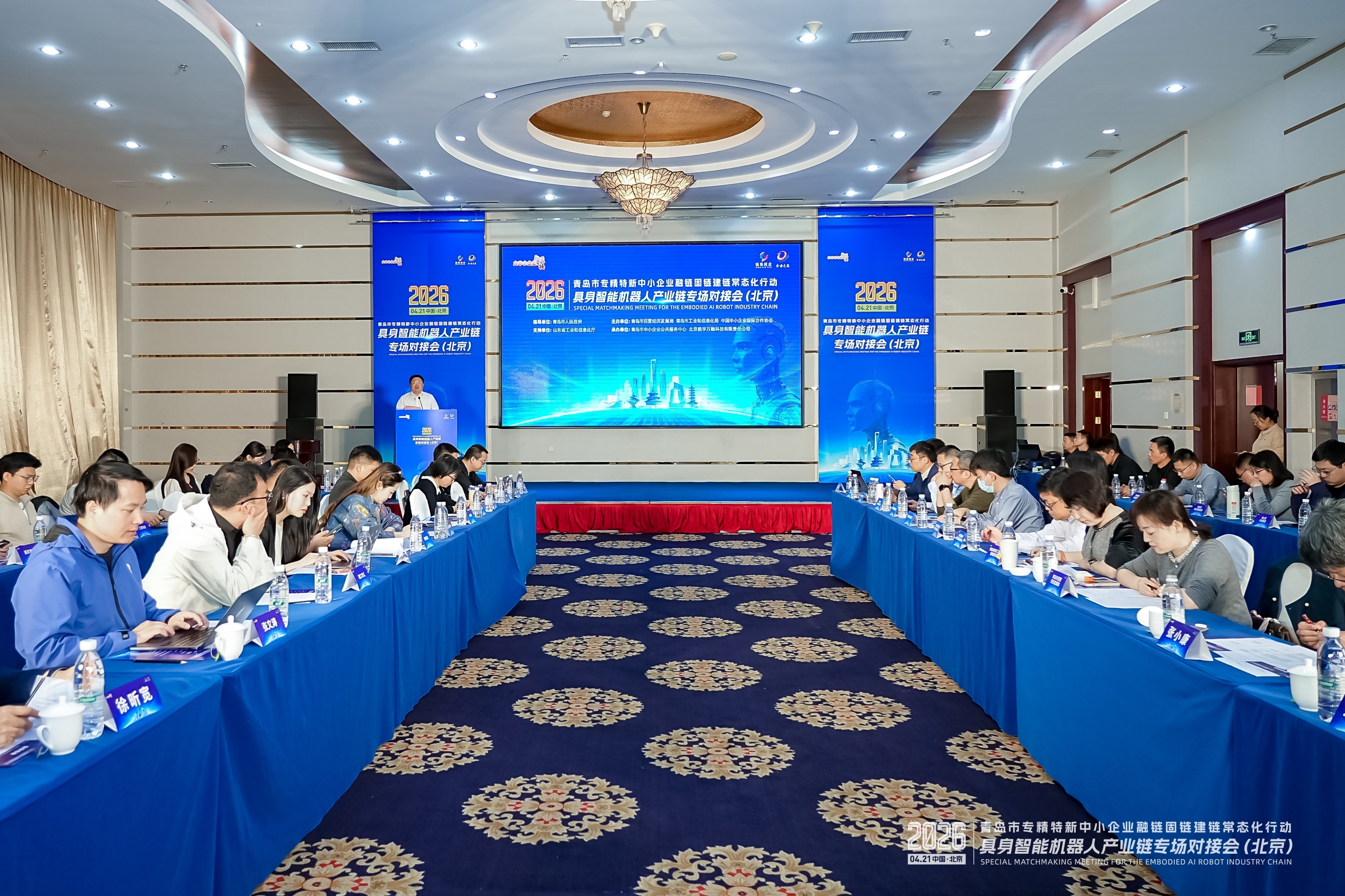4月20日至22日,2026年青岛市专精特新中小企业融链固链建链常态化行动人工智能产业链专场对接会在北京举行。本次活动由青岛市人民政府指导,山东省工业和信息化厅支持,青岛市民营经济发展局、青岛市工业和信息化局、中国中小企业国际合作协会主办,青岛市中小企业公共服务中心、北京数字万融科技有限责任公司承办。活动围绕具身智能机器人、垂直领域大模型等方向,通过机器人生态峰会投融资交流会、产业链专场对接会、重点企业参访等形式,加强产业链上下游协同联动,助力链上企业融通创新发展,推动京青两地创新资源深度融合。工业和信息化部中小企业发展促进中心领导,市民营经济局、市工业和信息化局、市发展改革委等有关负责同志,区市代表,链主企业代表,产业基金(国资平台)、创投机构代表,青岛及全国相关产业链优质中小企业代表近百人共同参加活动。青岛市民营经济发展局局长郭振栋出席活动,并带队前往用友集团北京总部、梅卡曼德机器人、面壁智能等企业考察调研。