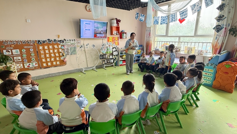 “今天,老师带来了一首儿歌,小朋友们竖起耳朵,认真听一听……”4月13日,皮山县合肥幼儿园中一班的教室里,20名孩子端坐在小椅子上,目光齐刷刷望向嵌在黑板中央的屏幕。教师张珍珍指尖轻点手中的平板,一首童趣盎然的动画儿歌音画跃然屏上……
