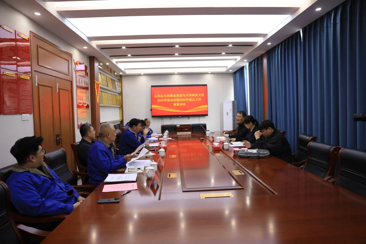 2026年4月23日,山东红太阳酒业集团有限公司与天津科技大学2025年度工作总结暨2026年重点工作部署会议在集团总部会议室顺利召开。双方围绕过去一年的合作成果进行系统复盘,并就新一年度深化产学研融合、培养白酒专项人才、推动鲁酒高质量发展等议题达成广泛共识。