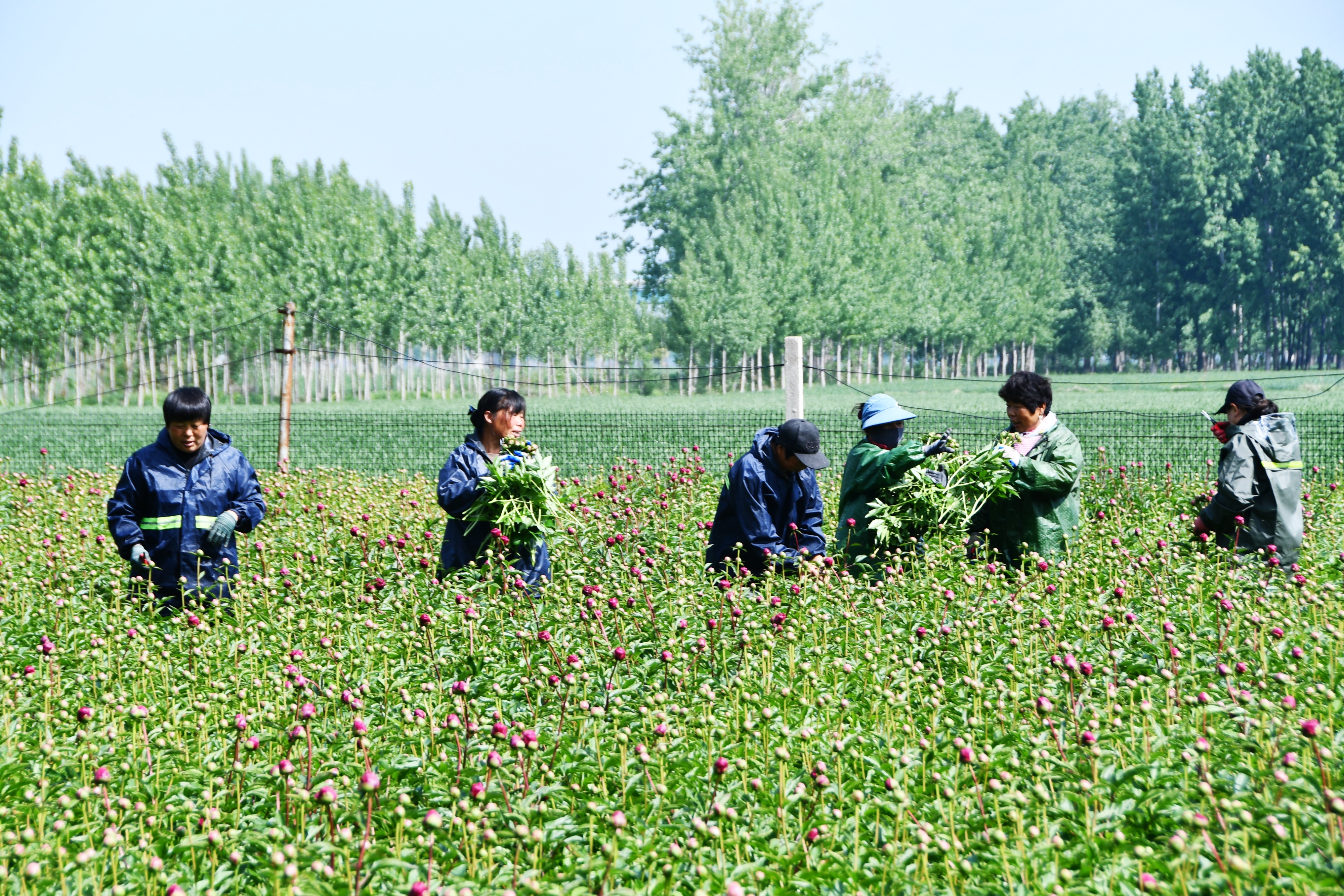 工人穿梭于姹紫嫣红的芍药花海,精心采摘鲜切花,朵朵鲜花托起增收希望。摄影:刘永霞