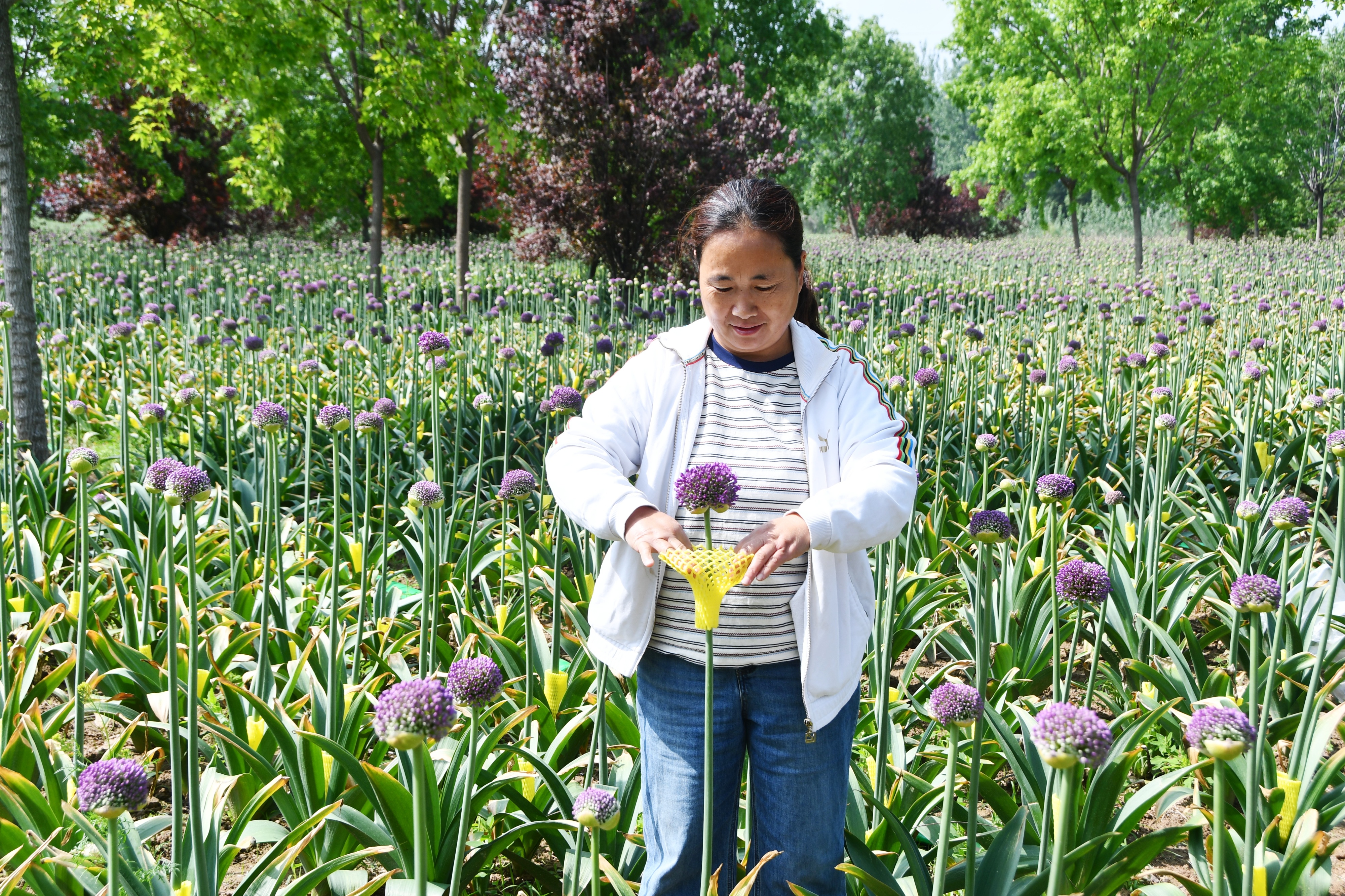 4月23日,山东省鄄城县郑营镇通汇苗木种植专业合作社的大田花海间,鲜切花大花葱迎来集中采收期。一朵朵球状大花葱亭亭玉立、肆意舒展,紫艳饱满的花球缀立枝头,在春风里摇曳生姿,连片紫韵绘就诗意田园,既扮靓乡村景致,更催生富民收益,实现田园添景、土地生金。