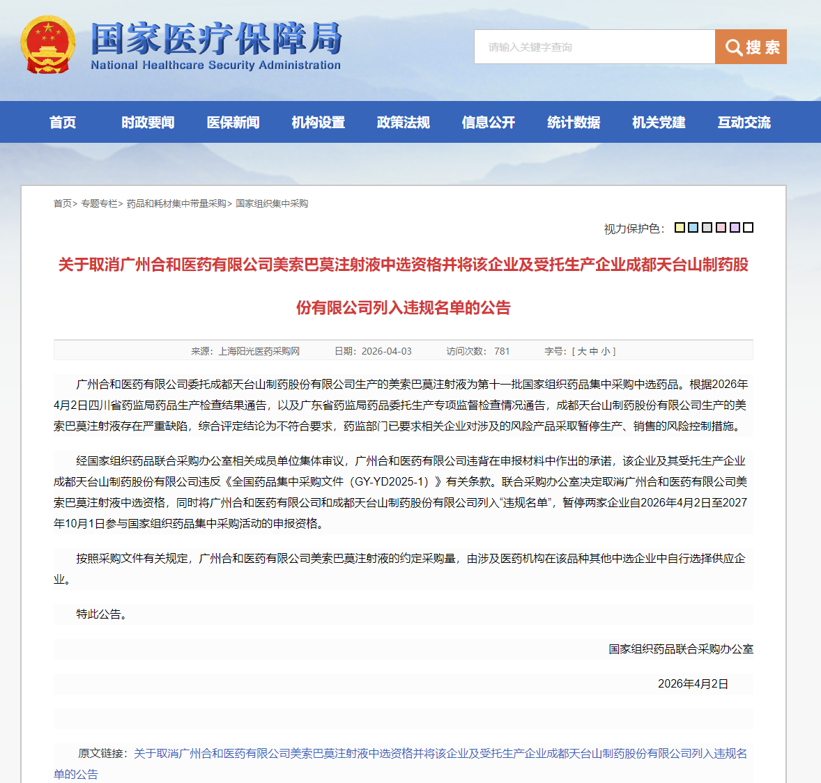 2026 年 4 月 2 日,国家组织药品联合采购办公室(以下简称 “国家联采办”)发布重磅公告,因产品存在严重质量缺陷,取消广州合和医药有限公司(以下简称 “合和医药”)美索巴莫注射液的第十一批国家药品集采中选资格,并将合和医药及其受托生产企业成都天台山制药股份有限公司(以下简称 “天台山制药”)双双列入 “违规名单”,暂停两家企业18 个月内参与国家组织药品集中采购活动的申报资格,彰显集采质量 “零容忍” 的坚定态度。