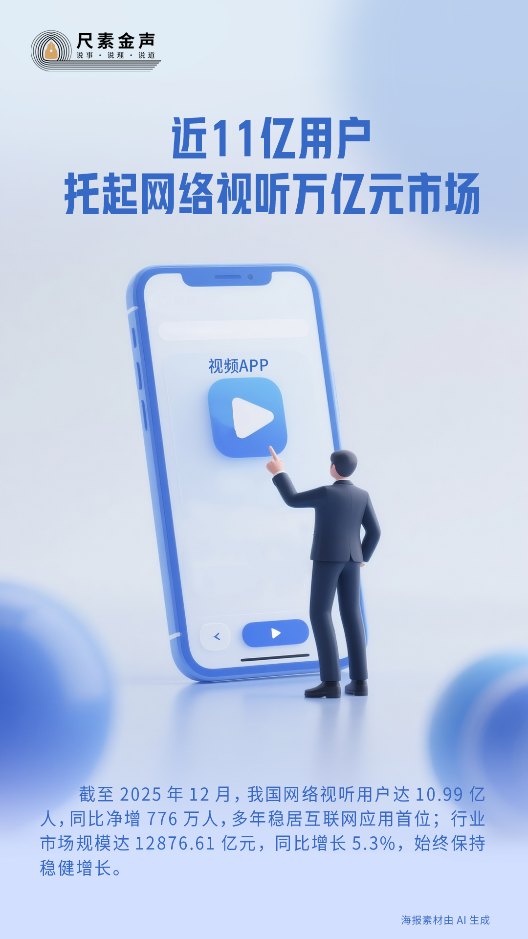 近日,第十三届中国网络视听大会上,《中国网络视听发展研究报告(2026)》正式发布。一组跃动的数据,勾勒出产业发展的蓬勃态势:截至2025年12月,我国网络视听用户达10.99亿人,同比净增776万人,多年稳居互联网应用首位;行业市场规模达12876.61亿元,同比增长5.3%,始终保持稳健增长。