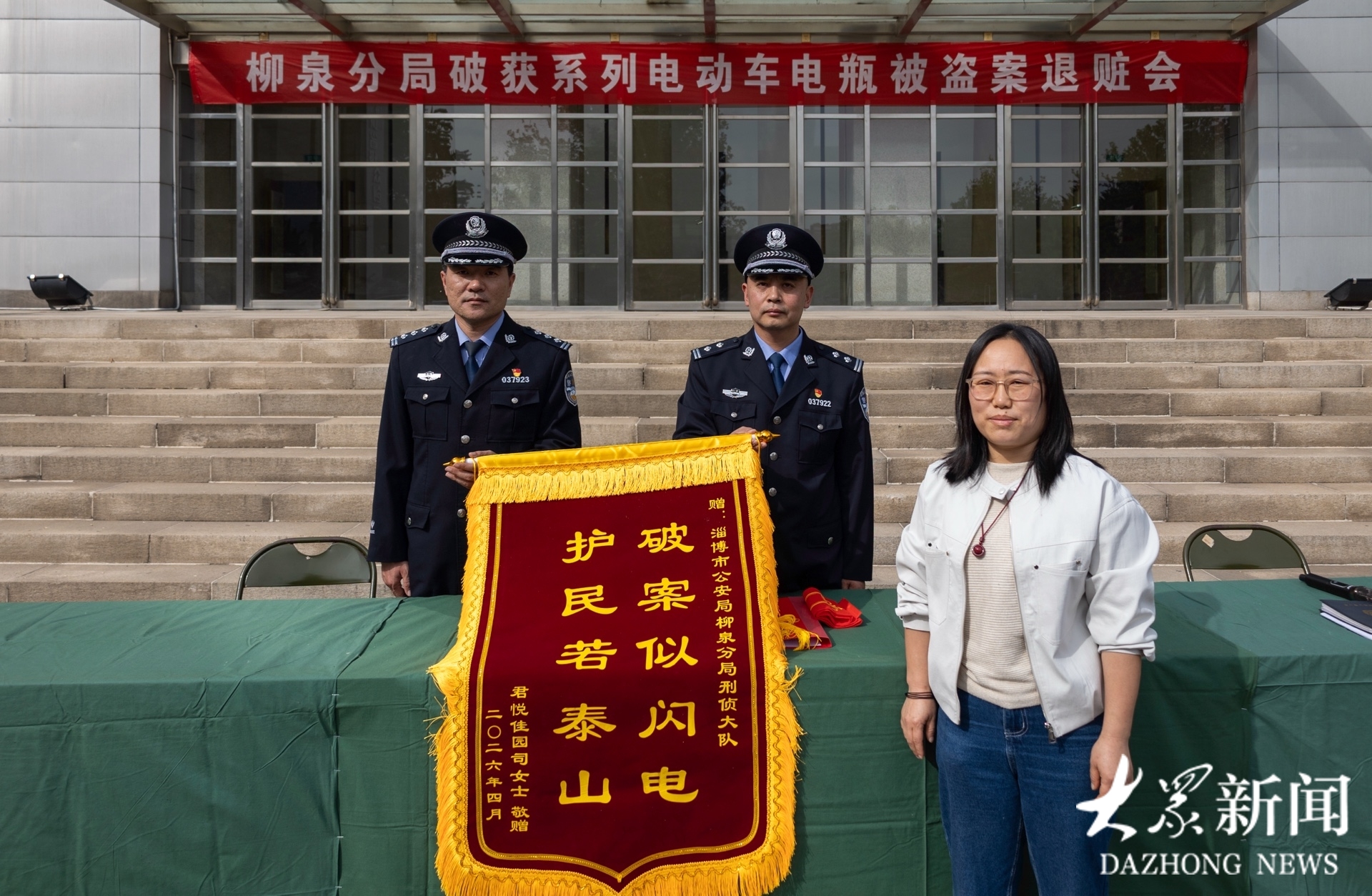 民生无小事,枝叶总关情。电动车电瓶盗窃看似民生 “小案”,却直接牵动群众切身利益,影响日常出行。4 月 22 日下午,淄博市公安局柳泉分局举行系列电动车电瓶被盗案集中退赃大会,将侦破案件追回的全部赃款、赃物现场返还受害群众,用实际行动践行为民初心,守护群众财产安全。