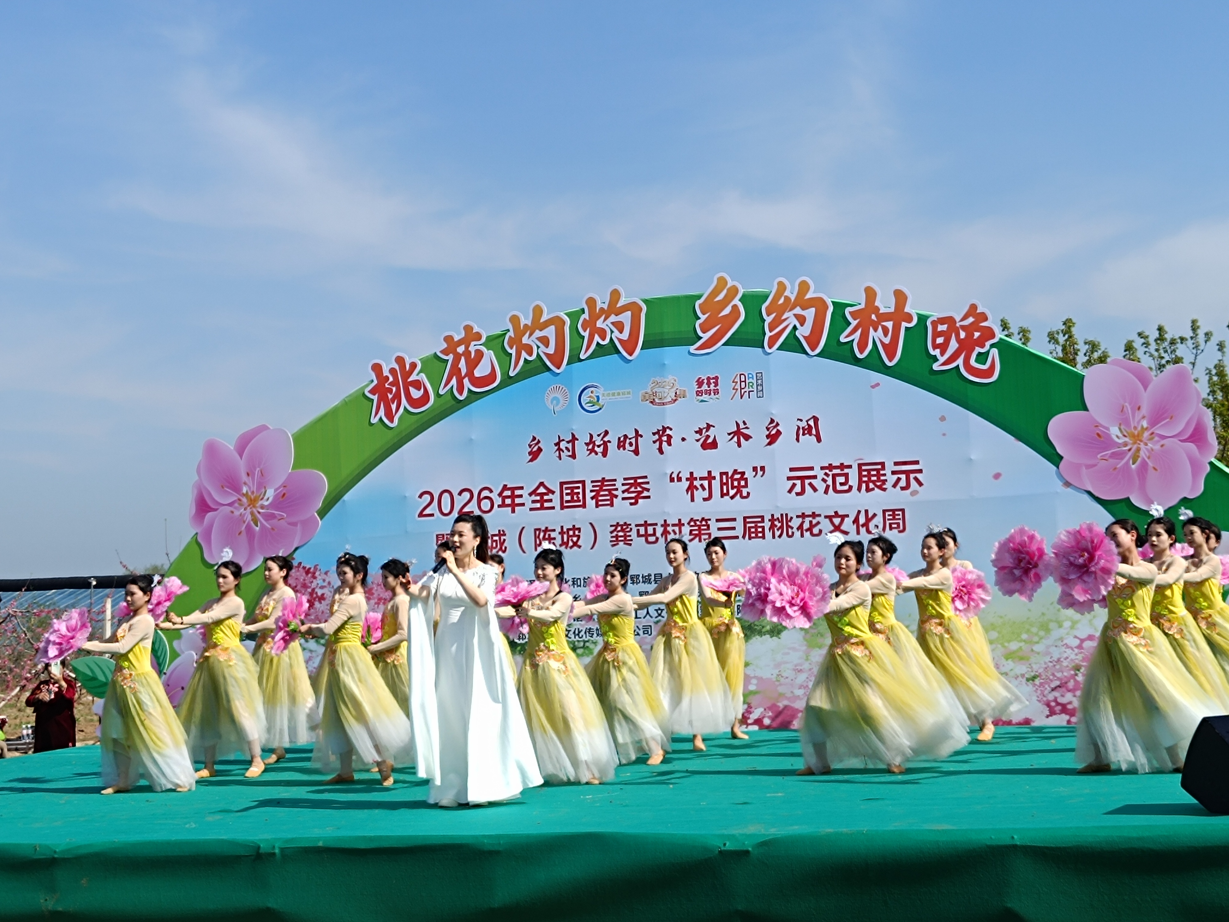在陈坡乡龚屯村,上百亩桃花次第绽放。这个曾经的传统村落,如今已蝶变为“全国春季村晚示范展示点”。日前,2026年全国春季“村晚”示范展示暨第三届桃花文化周在这里举办,将群众文化盛宴与本土桃花节品牌深度融合。