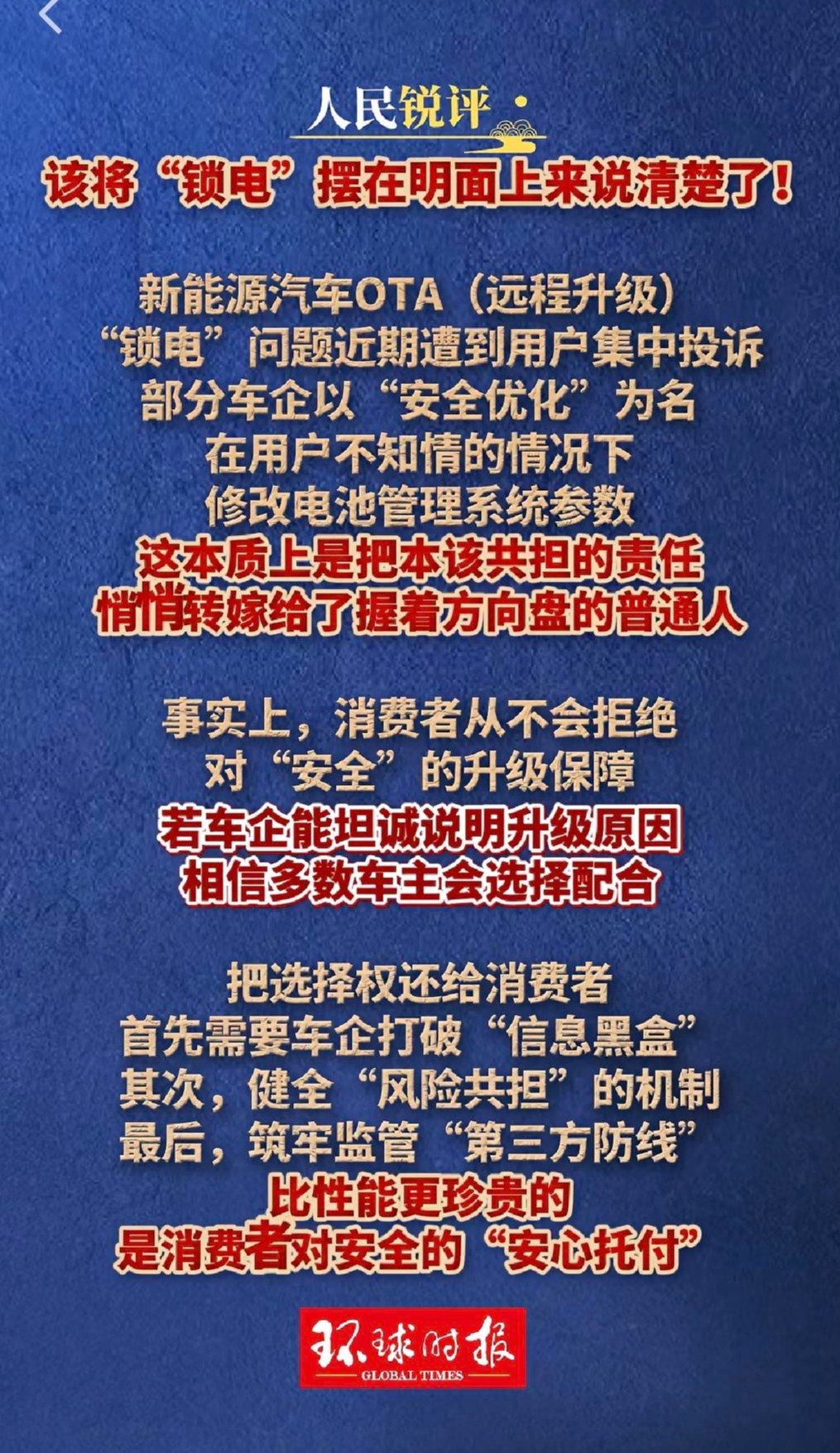 比体验设计失衡更值得警惕的,是信息不透明带来的安全信任问题。人民日报近期聚焦新能源汽车 “锁电” 现象直言,部分企业在用户不知情的情况下,以安全优化为名修改电池管理系统参数,本质上是把本该共担的责任,悄悄转嫁给手握方向盘的使用者。OTA 升级本是守护安全、优化性能的技术手段,一旦沦为 “暗箱操作”,便会消解用户的信任感,也让 “安全” 二字大打折扣。