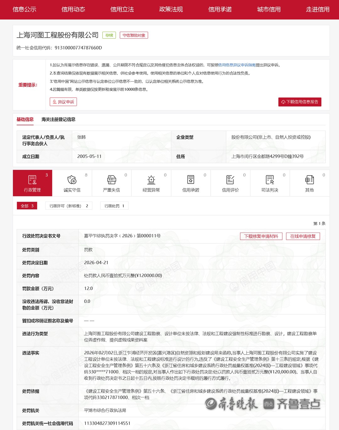 4月21日,信用中国公示了对上海河图工程股份有限公司(下称“上海河图”)行政处罚的决定。