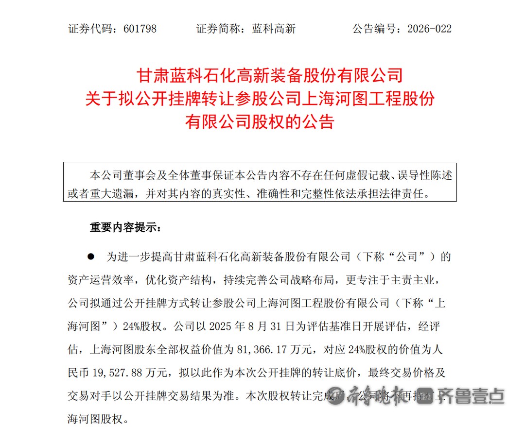 同日,蓝科高新(601798)公告,公司拟通过公开挂牌方式转让参股公司上海河图24%股权。经评估,上海河图股东全部权益价值为8.14亿元,对应24%股权的价值为1.95亿元,拟以此作为本次公开挂牌的转让底价,最终交易价格及交易对手以公开挂牌交易结果为准。