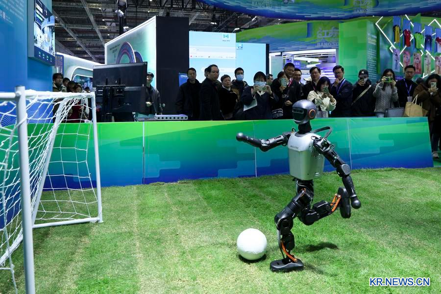 지난해 11월 20일 '제6회 창장(長江)삼각주 국제문화산업박람회' 장쑤(江蘇) 전시구역에서 휴머노이드 로봇이 축구를 시연하고 있다. (사진/신화통신)