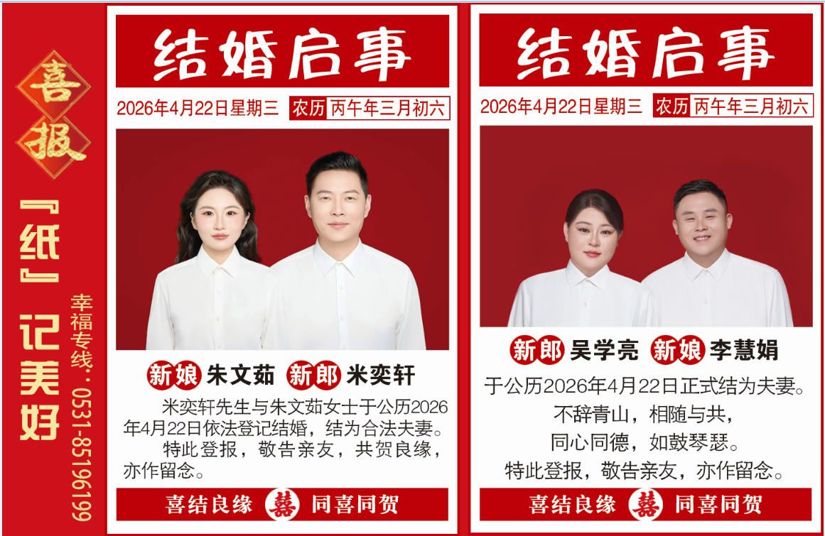 一纸婚书,一生约定 一张报纸,一份传家让墨香替你珍藏心跳的每一帧又有两对新人在《齐鲁晚报》发布启事,官宣结婚。《齐鲁晚报》创刊于1988年1月1日,以其贴近民生、贴近生活的特点深受读者喜爱。结婚的誓言,订婚的期许,生日的惊喜,周年庆的烟火,我们让幸福“上头条”。企事业单位公告挂失,个人挂失公告。刊登电话:0531-85196199,15588886080