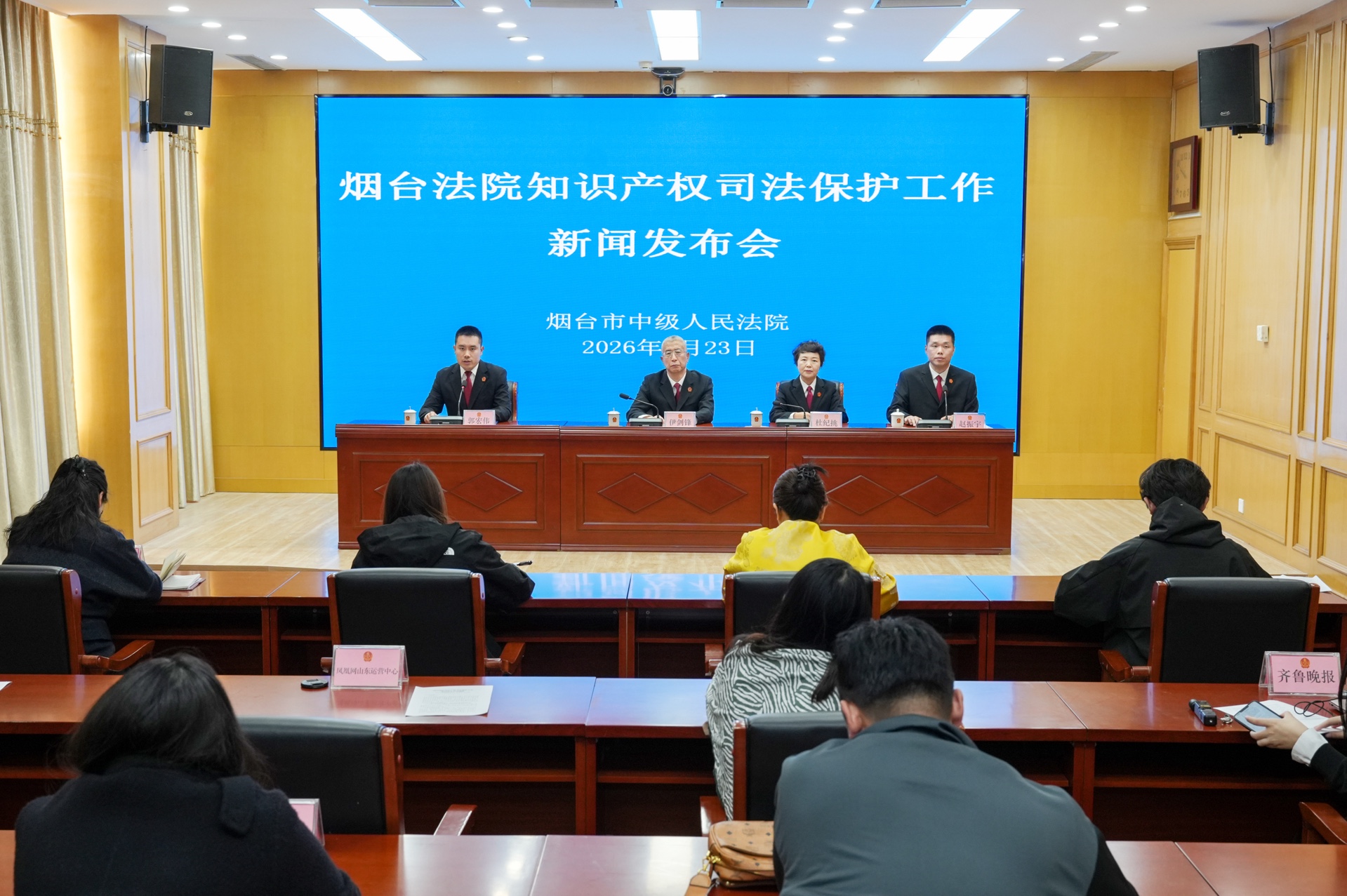 4月23日,在第26个世界知识产权日来临之际,烟台市中级人民法院召开新闻发布会,发布《2025年度烟台市知识产权司法保护白皮书》及十大典型案例,烟台中院党组副书记、副院长伊剑锋作主旨通报,审判委员会专职委员杜纪挑同步发布了知识产权司法保护特色品牌“海知蓝·新质慧”,全面展现烟台法院知识产权司法保护新成效。