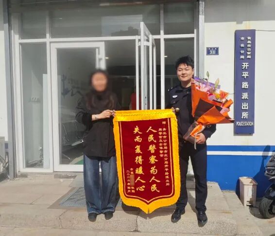 4月13日上午,刘女士专程来到开平路派出所,将锦旗与鲜花送到民警手中,对市北公安快速挽损、尽职尽责表示衷心感谢。