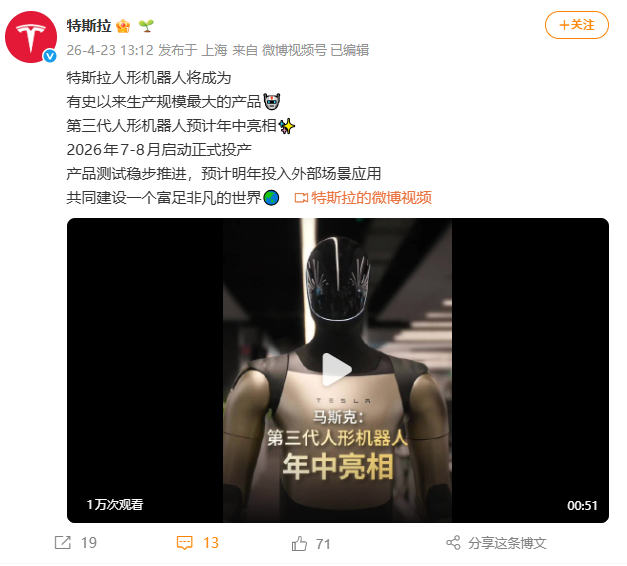 4月23日,特斯拉官方微博发文:特斯拉人形机器人将成为有史以来生产规模最大的产品,第三代人形机器人预计年中亮相,2026年7-8月启动正式投产,产品测试稳步推进,预计明年投入外部场景应用,共同建设一个富足非凡的世界。